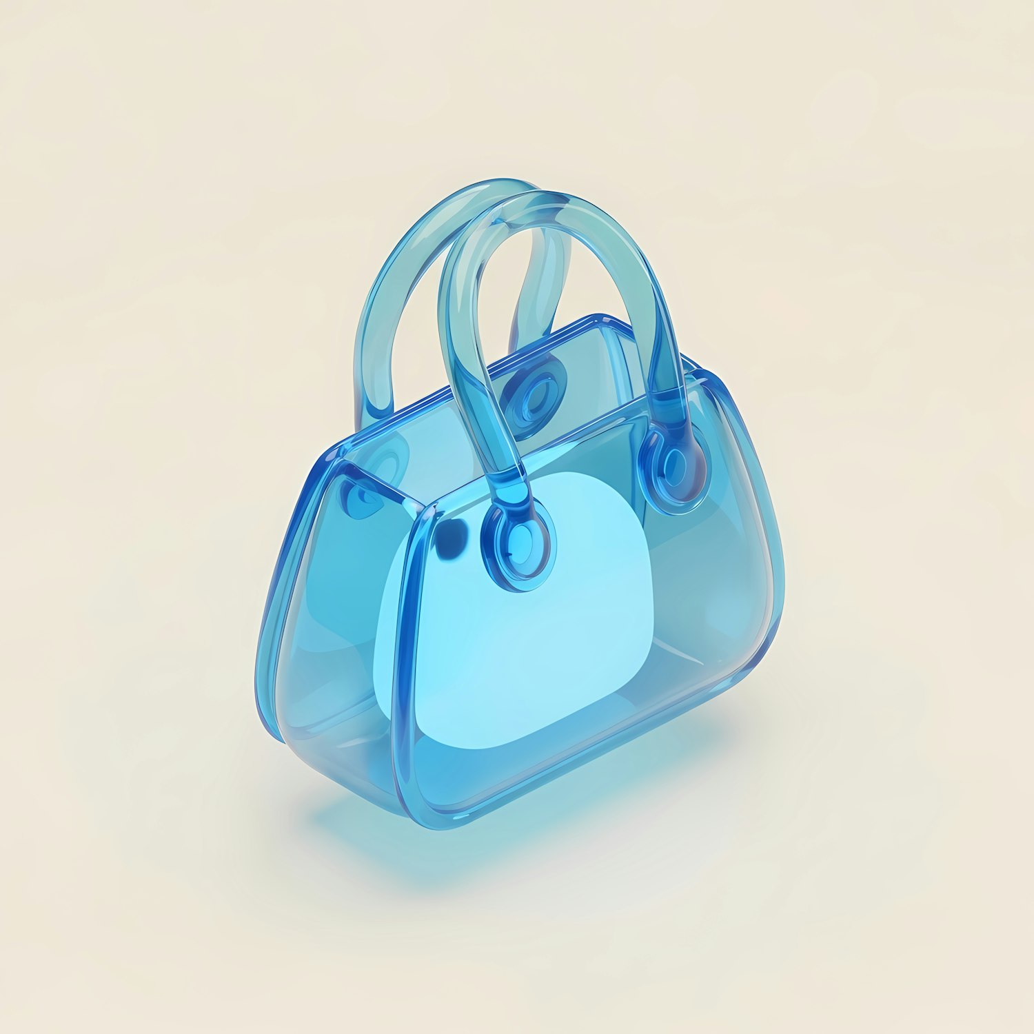 A sleek, transparent blue handbag rendered in 3D, showcasing a modern and minimalist design against a soft beige background.
