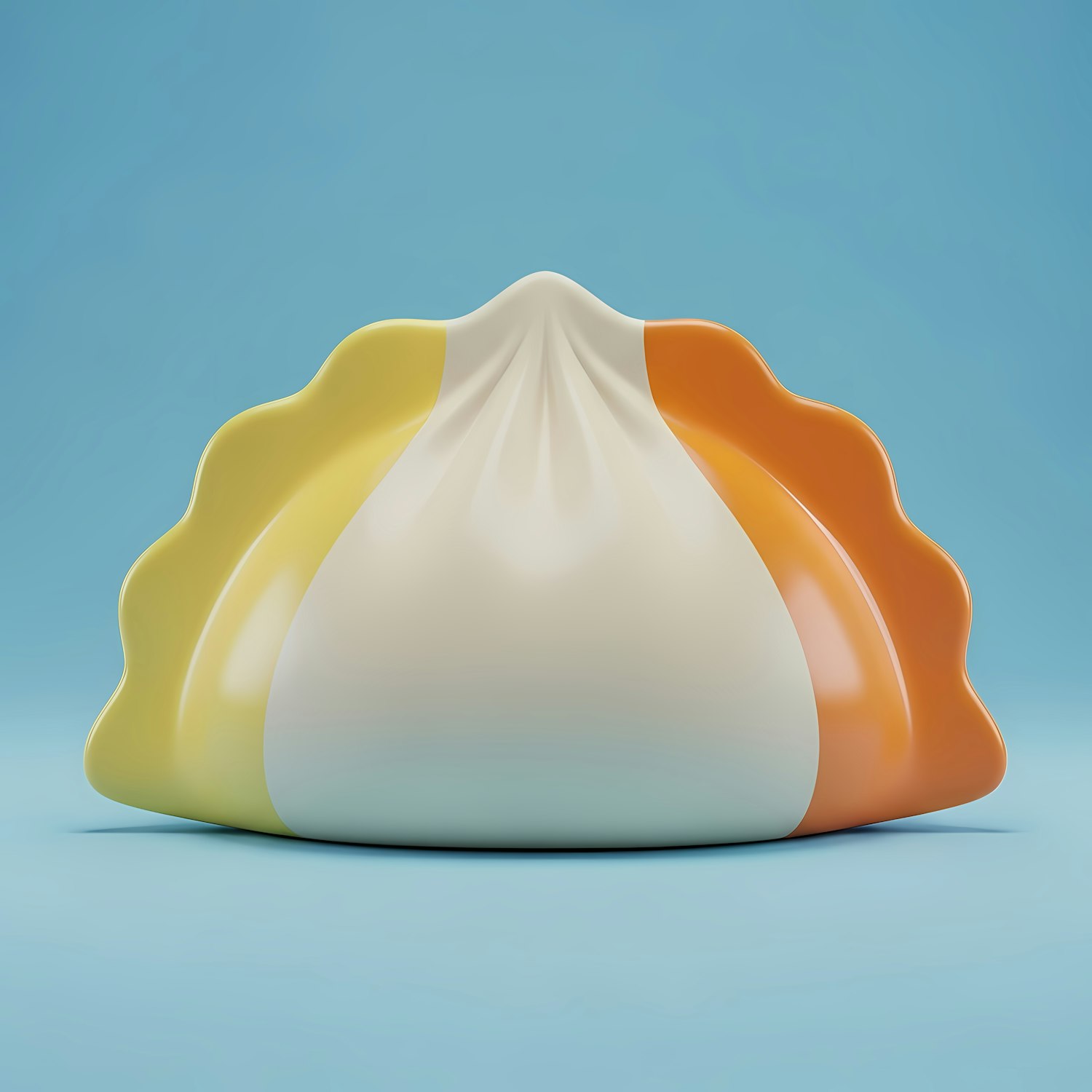 A colorful 3D-rendered dumpling with yellow, white, and orange sections on a light blue background. Fun and creative design!