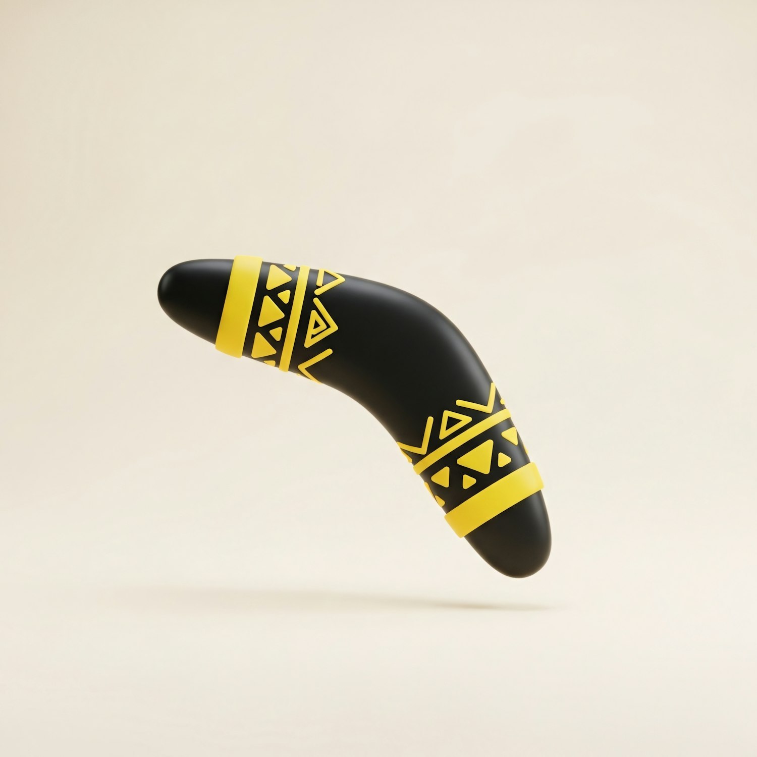 A black boomerang with yellow tribal patterns, set against a beige background, showcasing its smooth design and vibrant details.