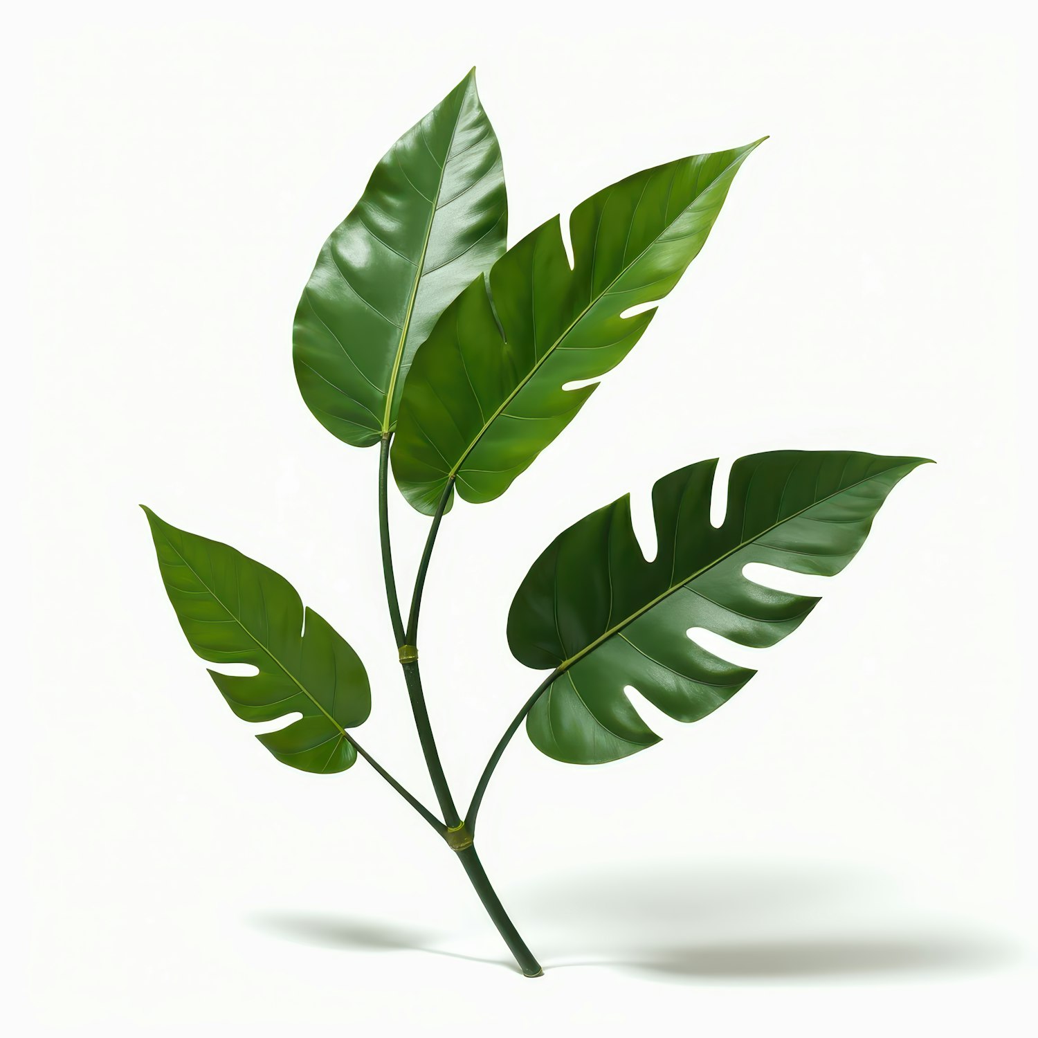 Vibrant Monstera plant branch with glossy green leaves, showcasing characteristic splits and holes against a plain background.