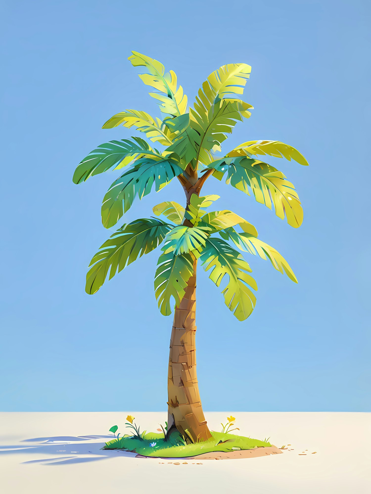 A colorful tropical palm tree illustration with lush fronds, a textured trunk, and a sunny blue sky backdrop. Perfect for beach vibes!