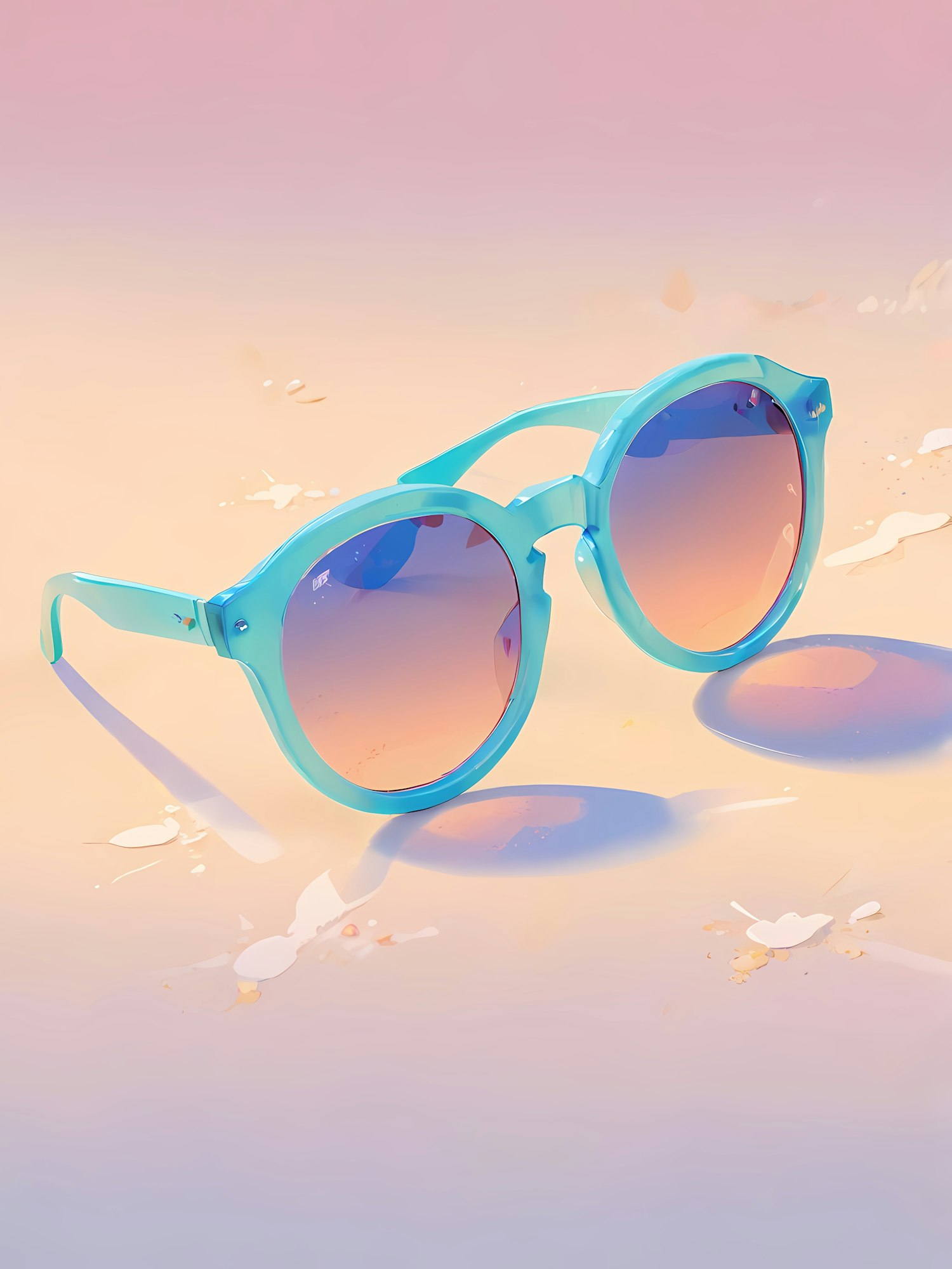 Turquoise round sunglasses with pink-to-blue gradient lenses on a pastel surface, perfect for a summery and artistic vibe.