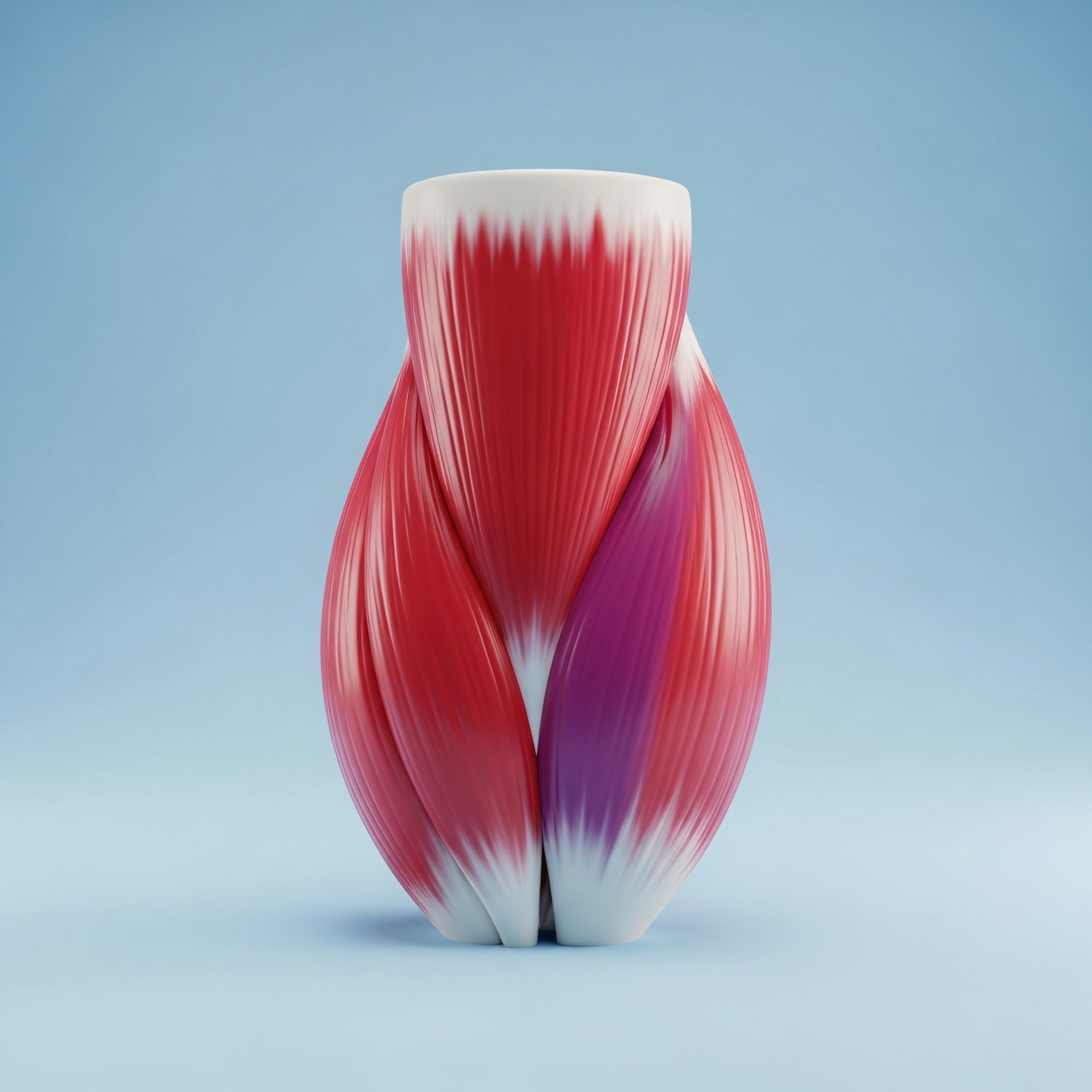 A sleek, colorful vase with a twisted design in red, pink, and white tones, set against a soft blue backdrop.