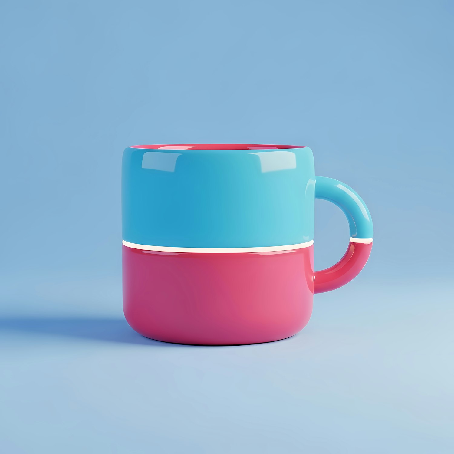 A vibrant two-tone mug with blue and pink sections, set against a light blue background. Perfect for modern and colorful kitchen decor.