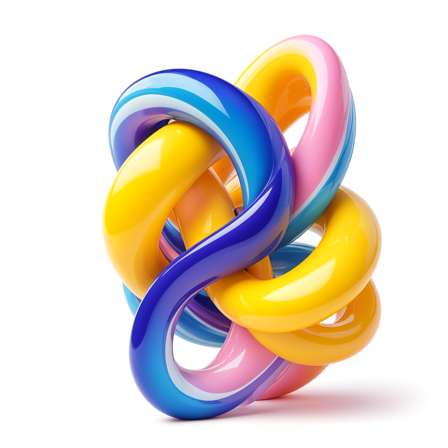 Glossy 3D abstract sculpture with interwoven loops in yellow, blue, pink, and purple on a white background. Perfect for modern art lovers.