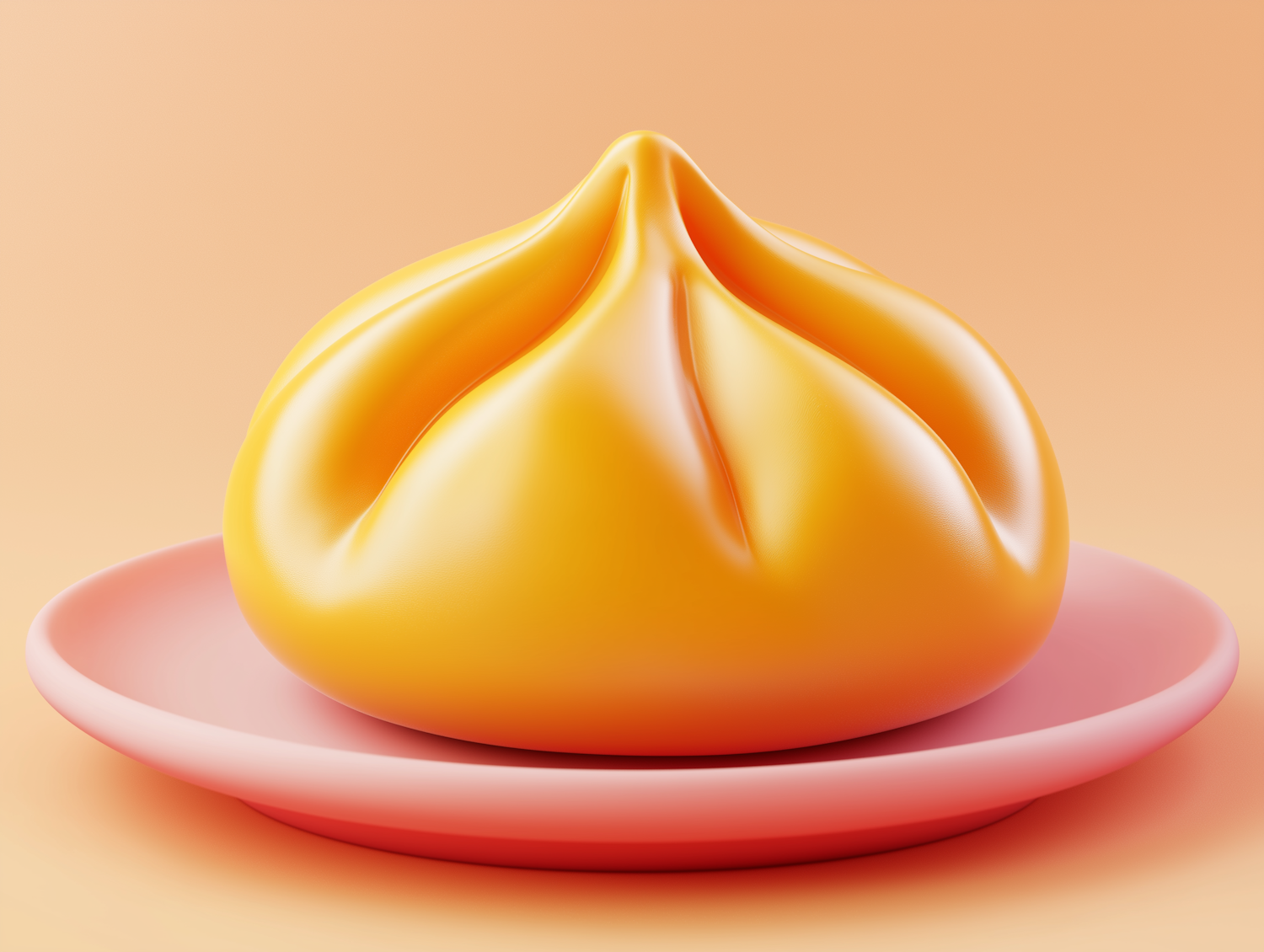 Glossy yellow dumpling on a pink plate with a warm peach background, highlighting its smooth texture and inviting appearance.