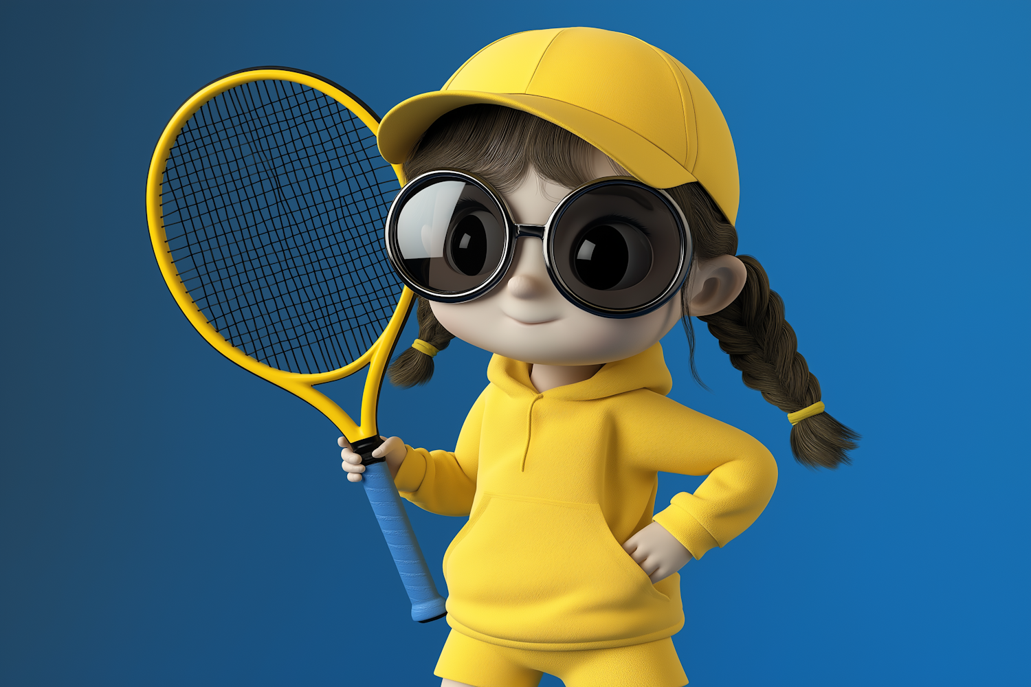Cartoon character in yellow outfit with tennis racket, oversized sunglasses, and braids against a blue background.