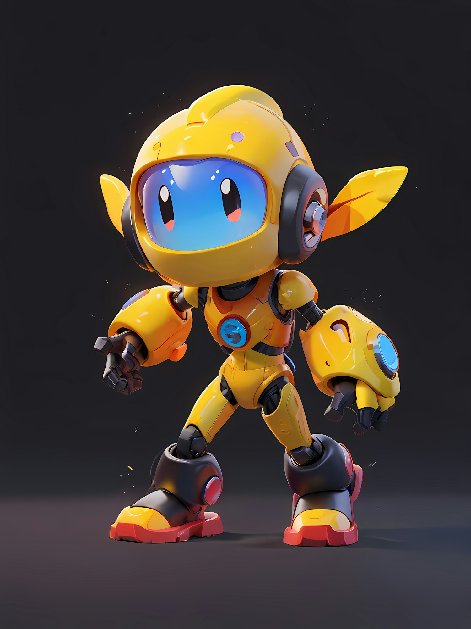 Bright yellow 3D robot with a glossy blue visor and glowing accents, standing confidently against a dark background. Futuristic and playful!