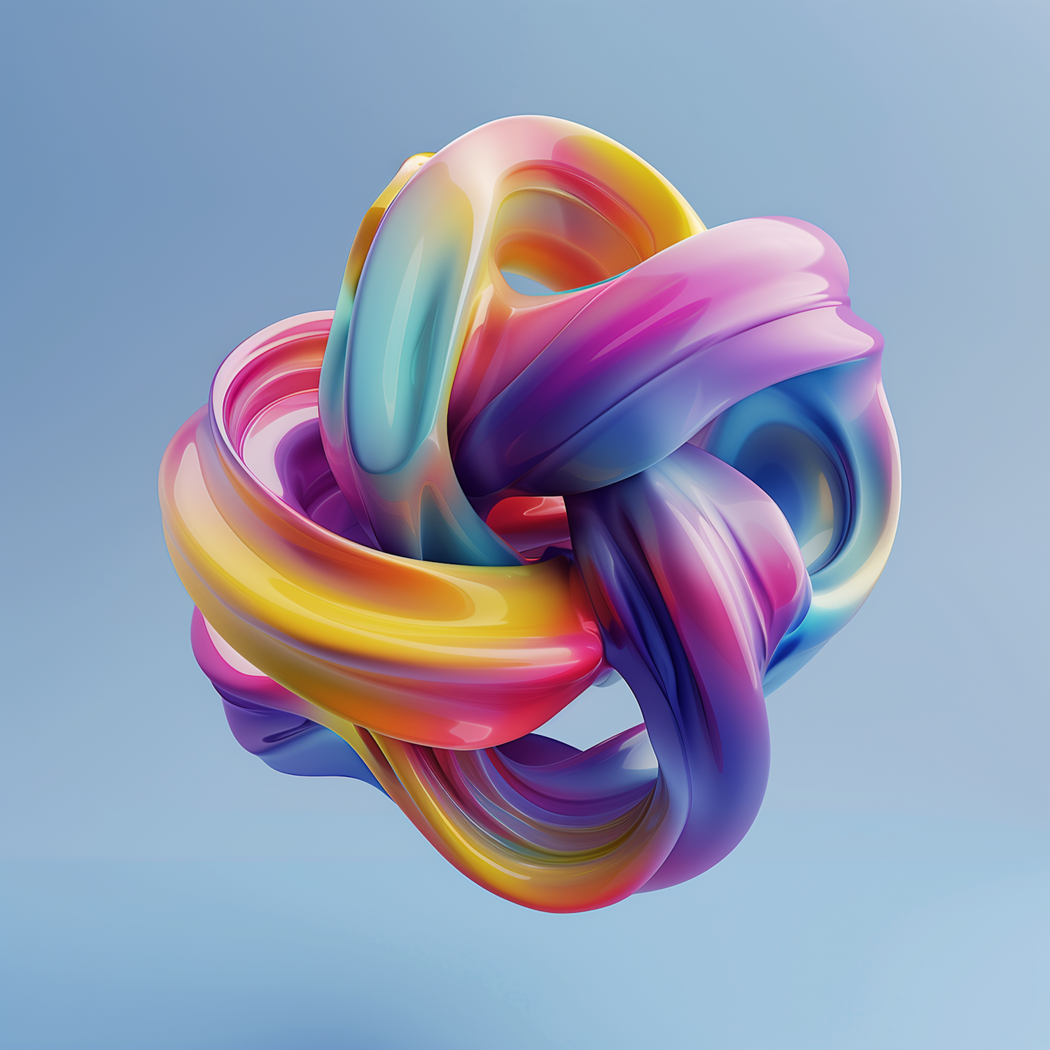 Colorful abstract 3D shape with glossy texture and vibrant hues, floating against a soft blue background.