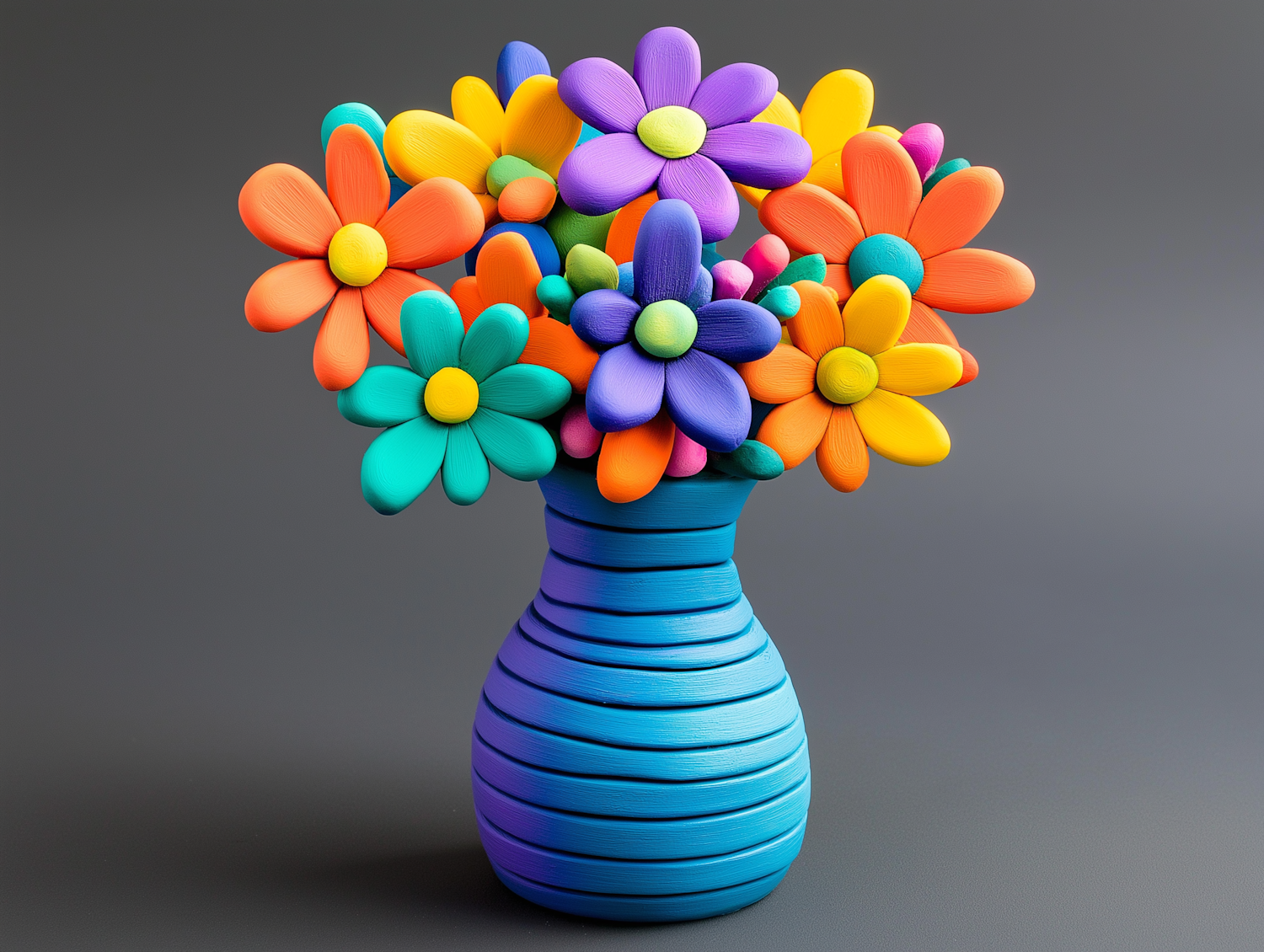 Colorful clay flower bouquet in a striped vase with vibrant petals in orange, yellow, purple, and teal against a gray background.