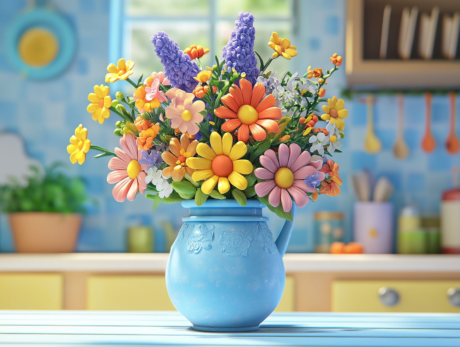 Vibrant bouquet of colorful flowers in a blue vase, set against a pastel kitchen background, exuding freshness and joy.