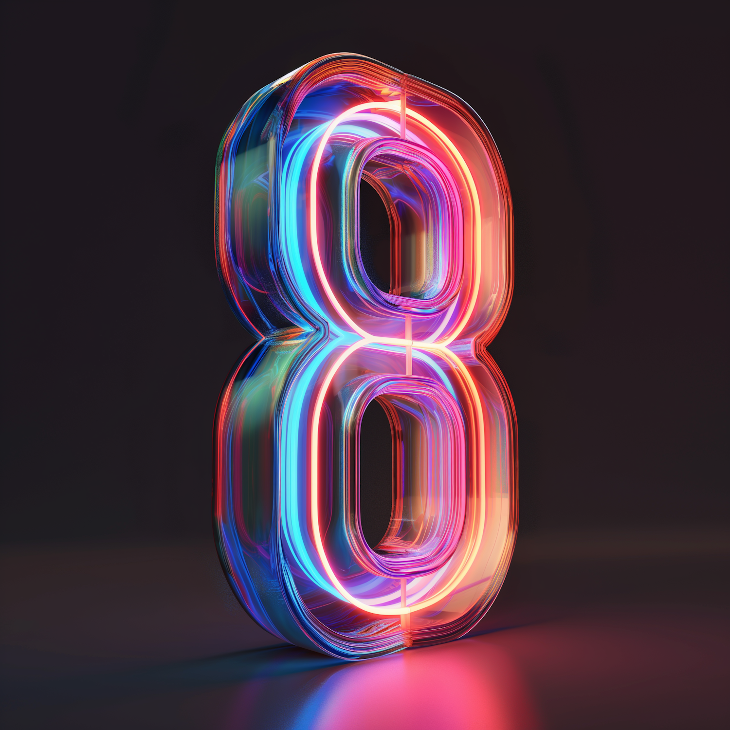 Vibrant 3D number eight with neon blue, pink, and red lights against a dark background, creating a dynamic and futuristic look.
