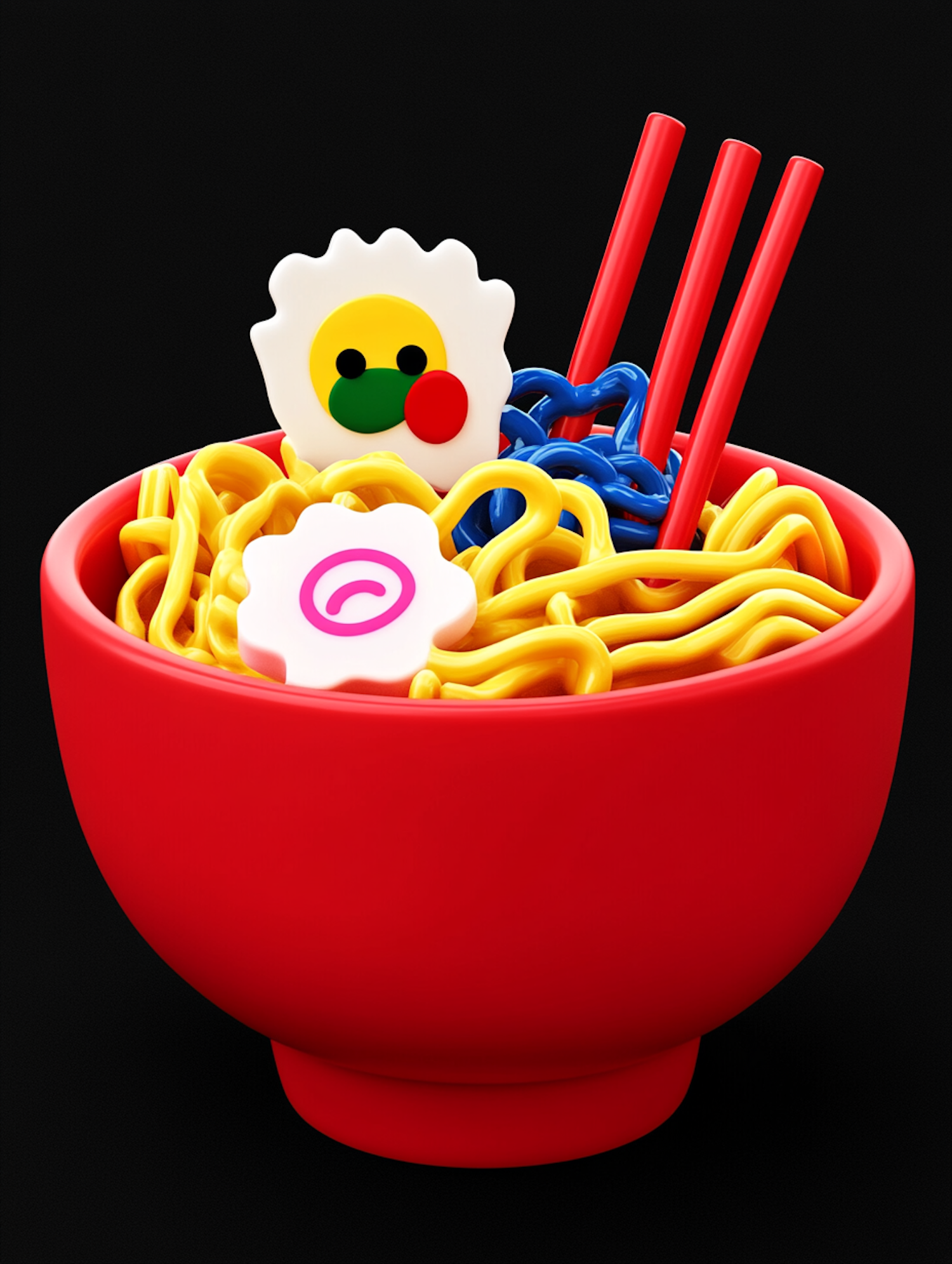 Playful 3D illustration of colorful noodles in a red bowl with quirky toppings and chopsticks, set against a black background.