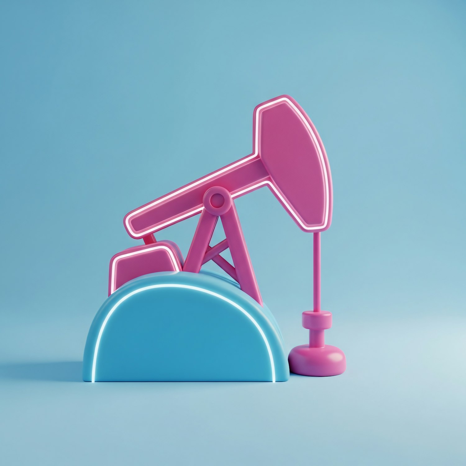 A vibrant 3D illustration of a pink oil pumpjack with neon accents on a blue background, showcasing a modern and minimalistic design.