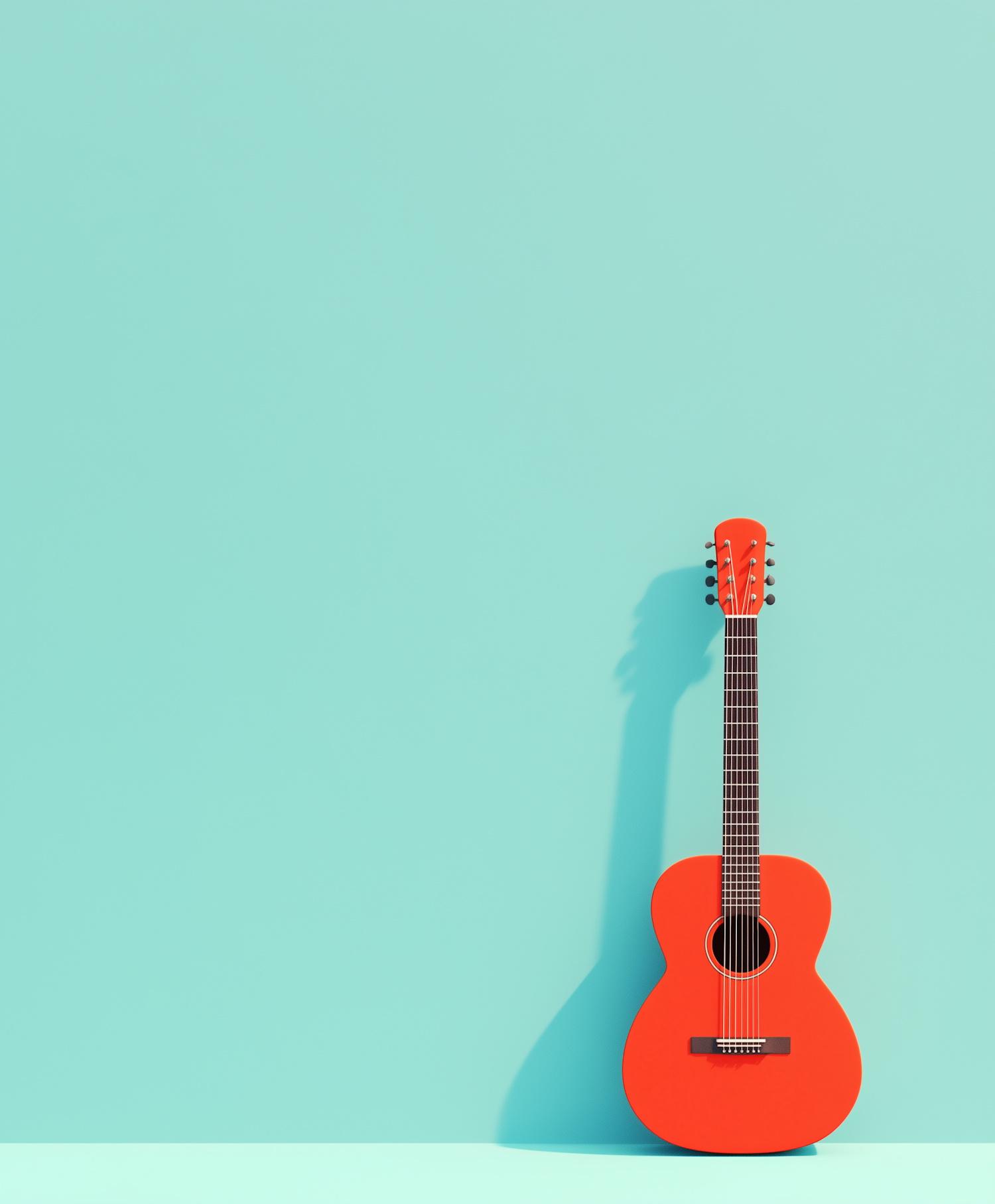 A red acoustic guitar against a turquoise wall, creating a bold and minimalist aesthetic with vibrant contrasting colors.