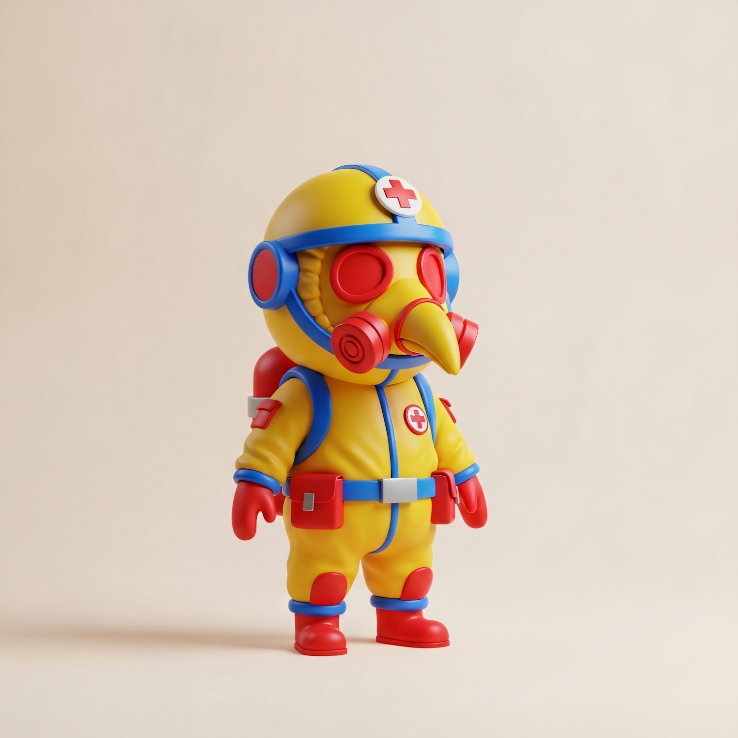 A vibrant 3D character in a yellow suit with red and blue accents, featuring a beak-like mask and a red cross emblem on the helmet.