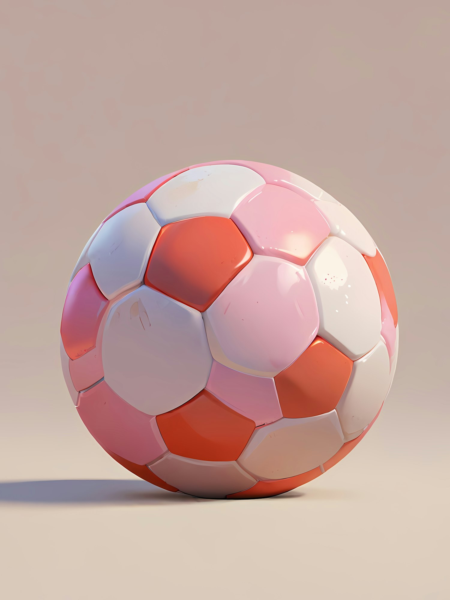 Glossy soccer ball with pink, orange, and white panels on a neutral beige background. Perfect for sports or design enthusiasts.