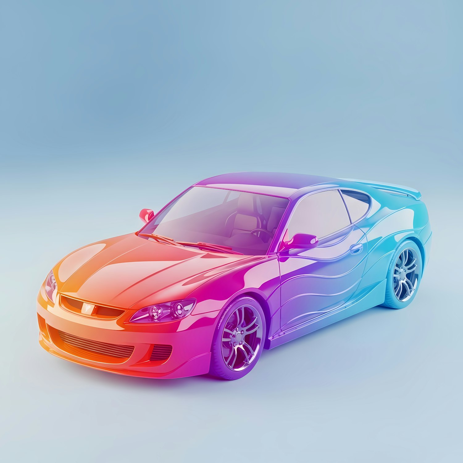 Vibrant gradient sports car with sleek curves and alloy wheels, set against a soft blue background. A modern and dynamic design.