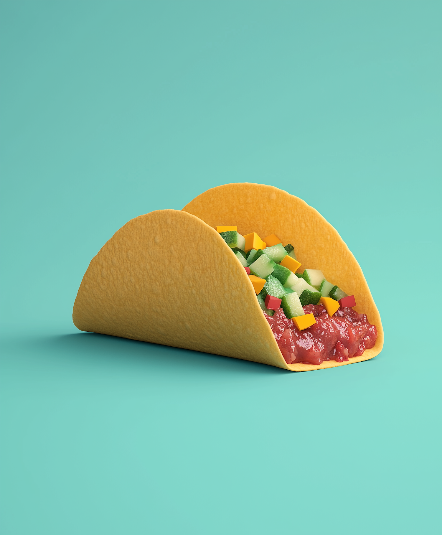 3D illustration of a colorful taco with fresh ingredients on a teal background, showcasing vibrant textures and colors.