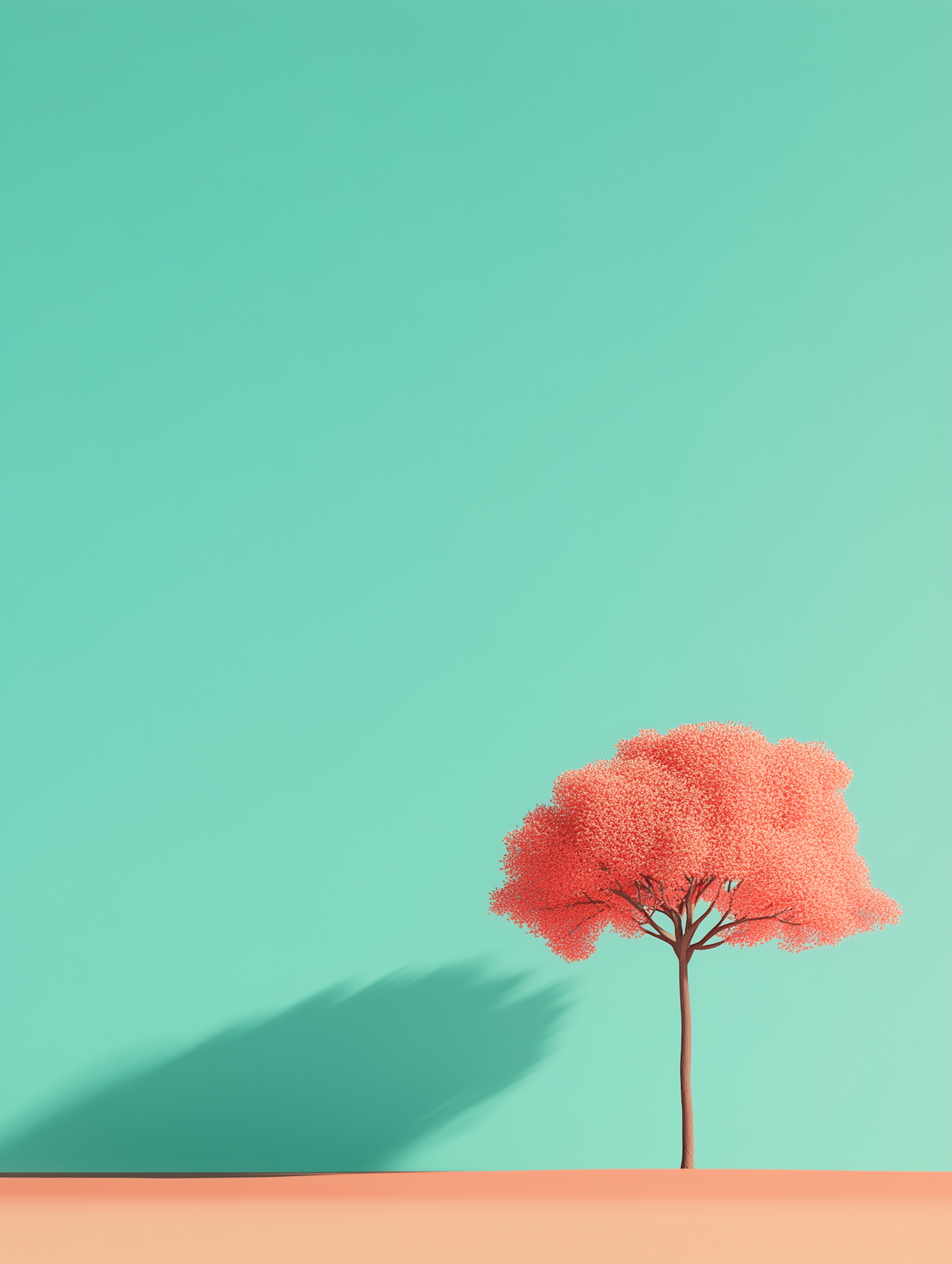 Minimalist scene with a pink tree against a turquoise background, creating a modern and artistic contrast with bold colors.