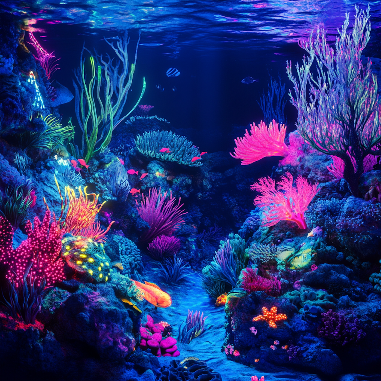 Vibrant underwater scene with neon corals and colorful fish, creating a mesmerizing and serene aquatic landscape.