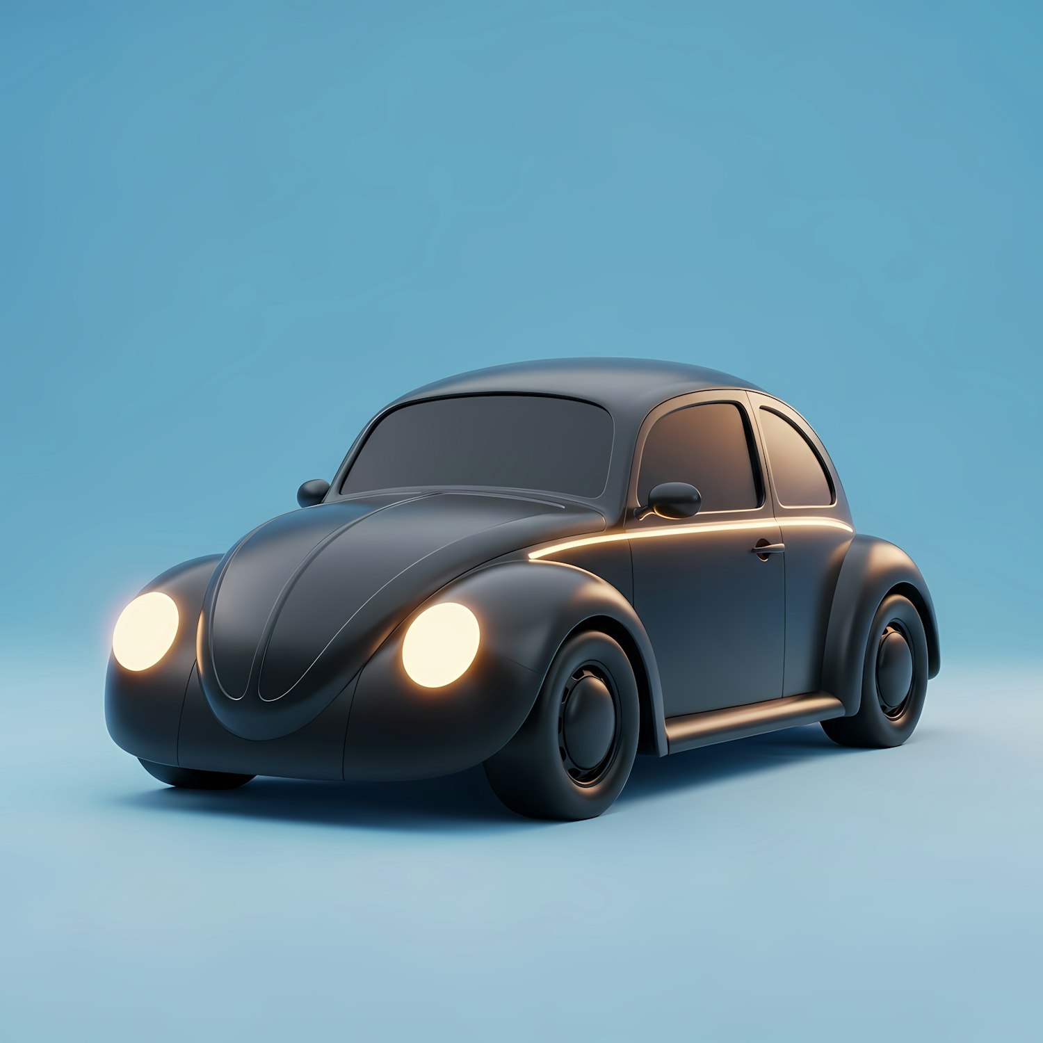 Stylized 3D rendering of a classic black car with glowing headlights, set against a smooth blue gradient background.