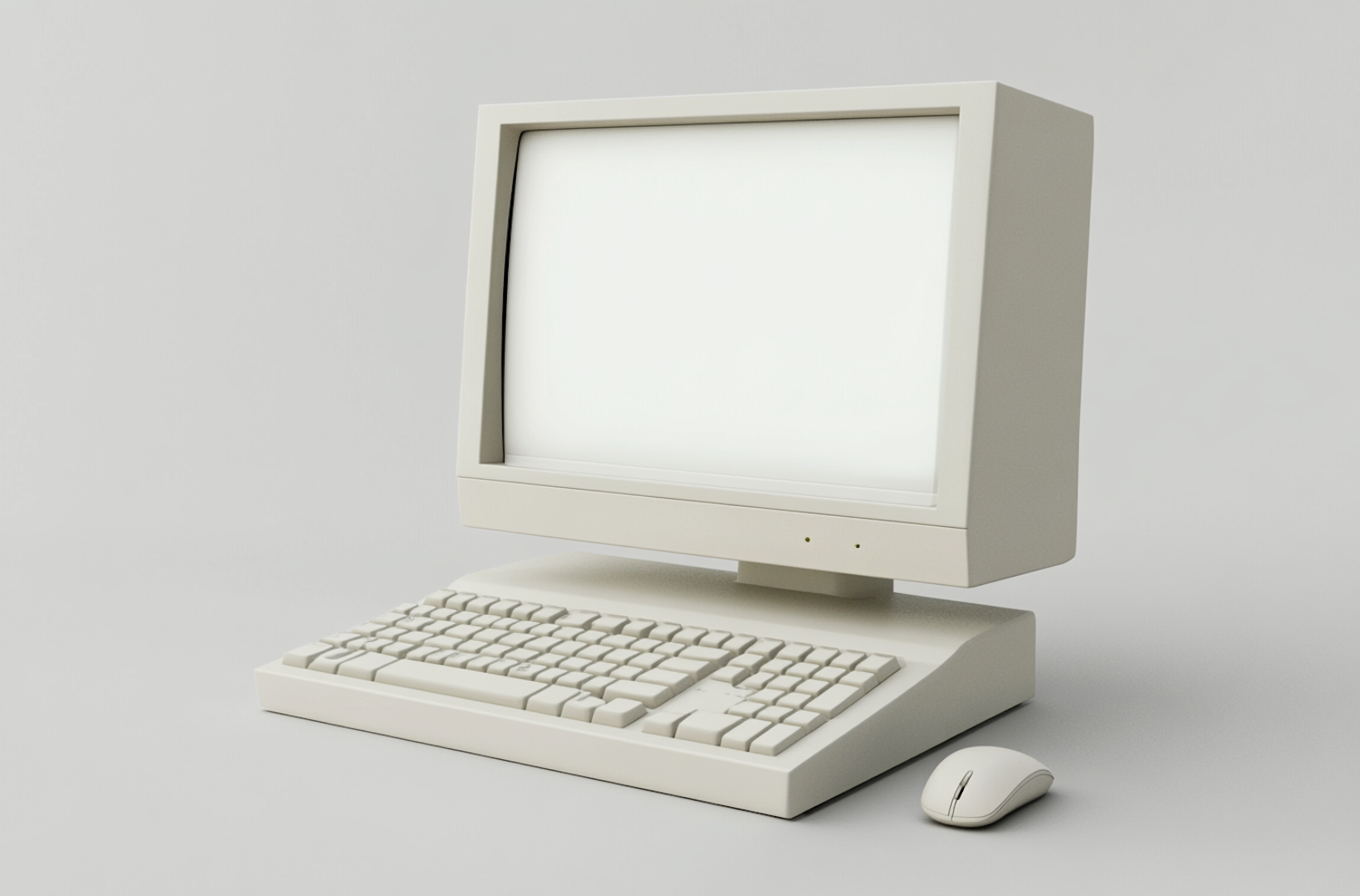 Vintage beige computer setup with CRT monitor, keyboard, and mouse on a light gray background.