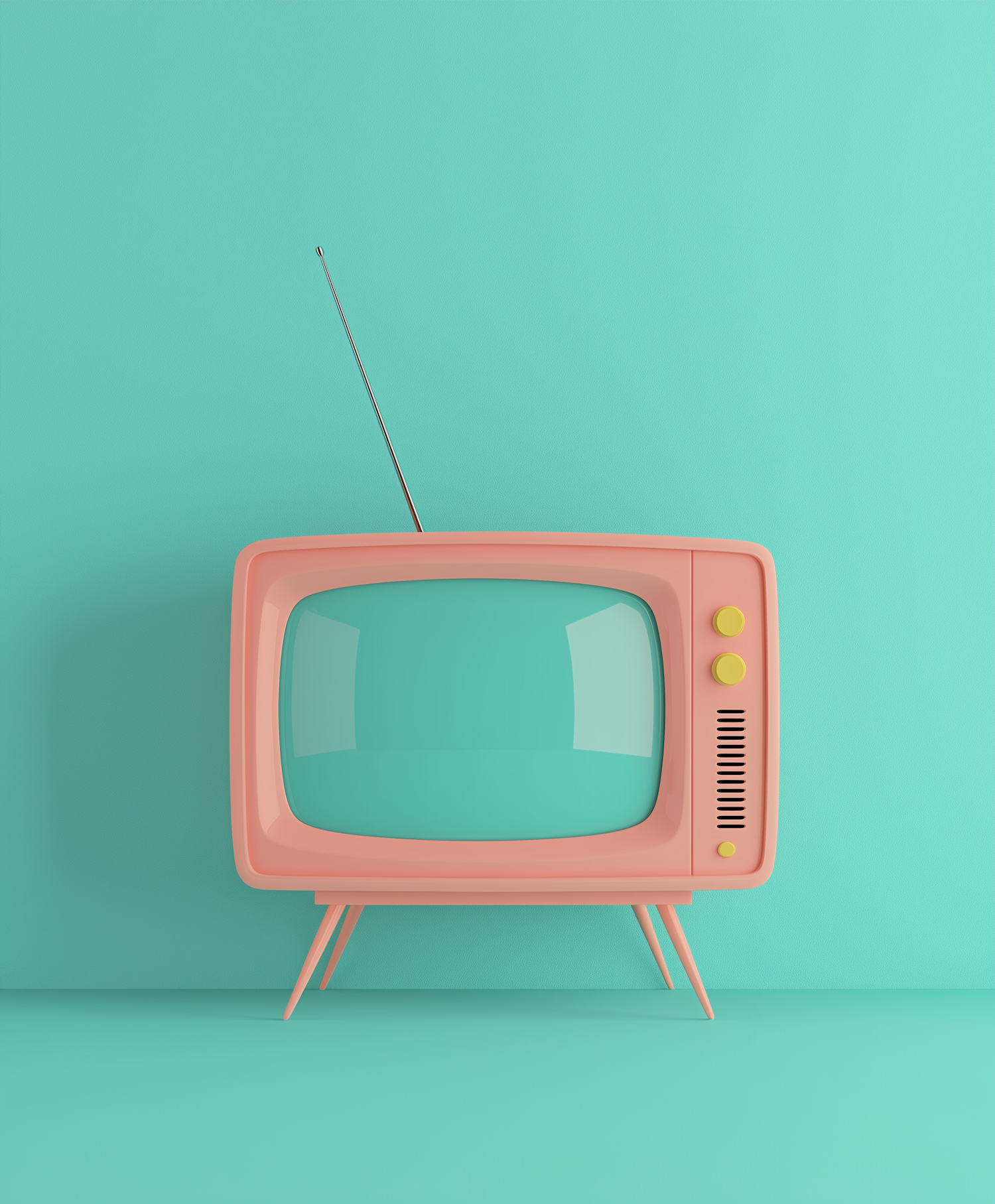 Retro coral TV with yellow knobs against a turquoise background, featuring a vintage antenna and mid-century modern design.