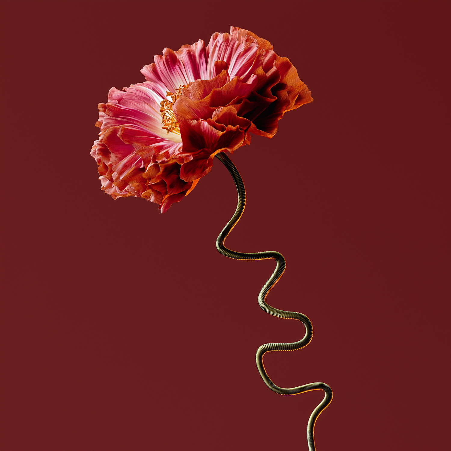A vibrant red and pink flower with a coiled metallic stem against a deep maroon background, creating a surreal and artistic vibe.