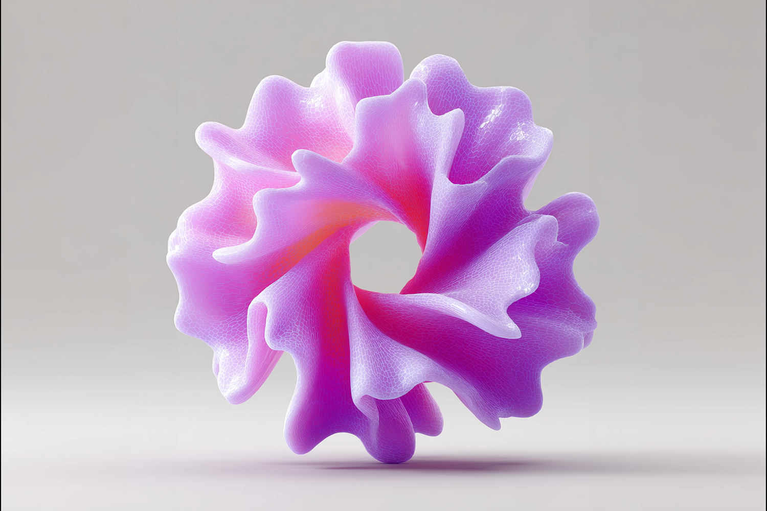 A stunning 3D-rendered toroidal shape with flowing, petal-like structures in vibrant pink and purple hues, set against a neutral background.