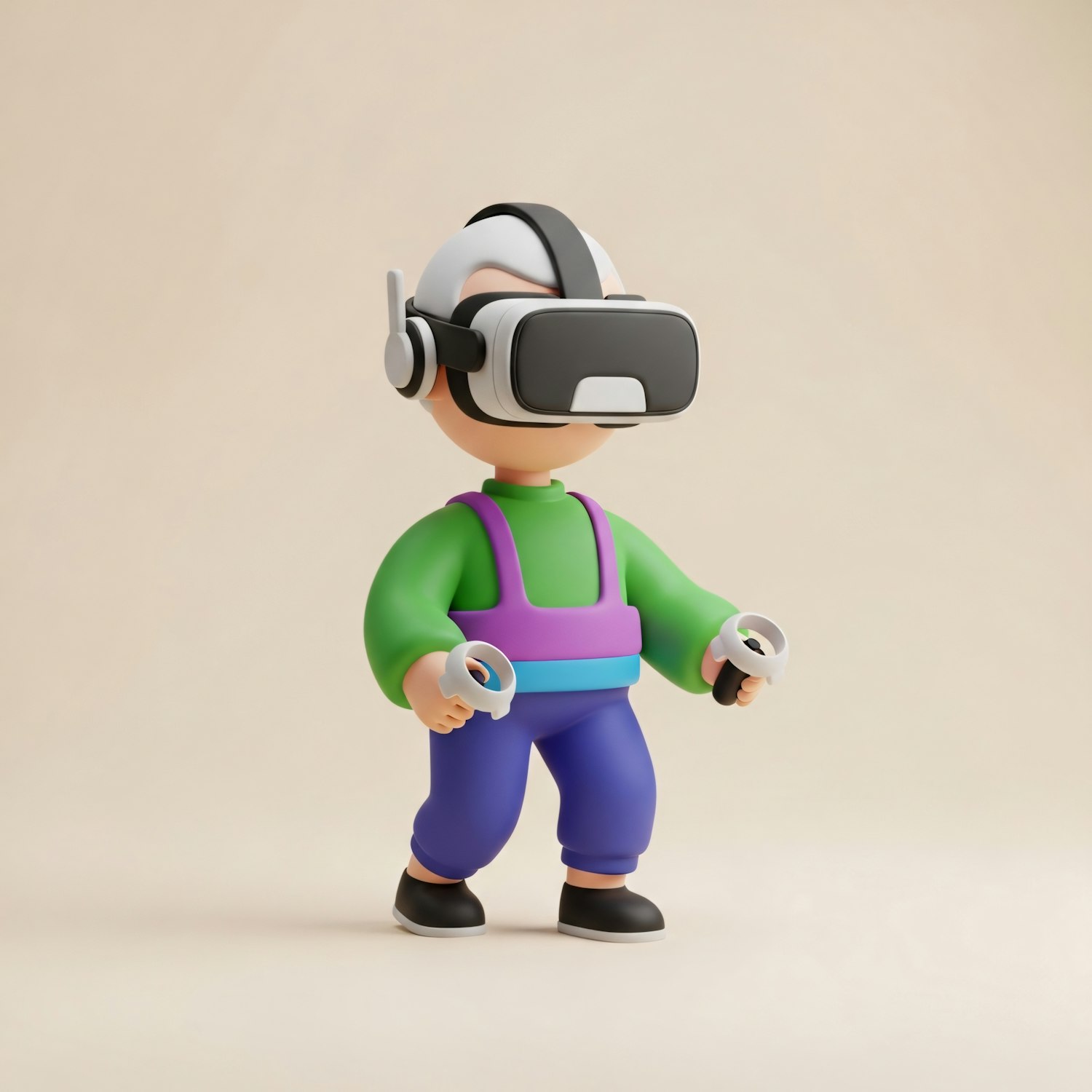 A 3D illustration of a cartoon character using a VR headset and controllers, dressed in colorful attire against a neutral background.
