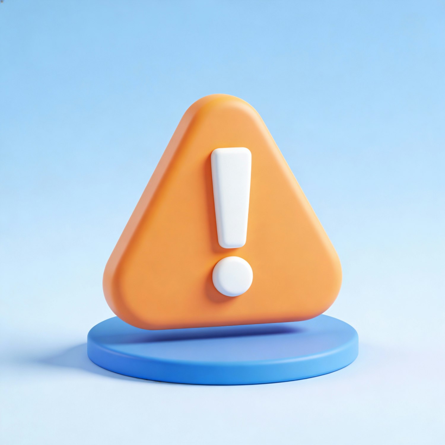 3D-rendered orange warning sign with exclamation mark on a blue base, set against a light blue gradient background.