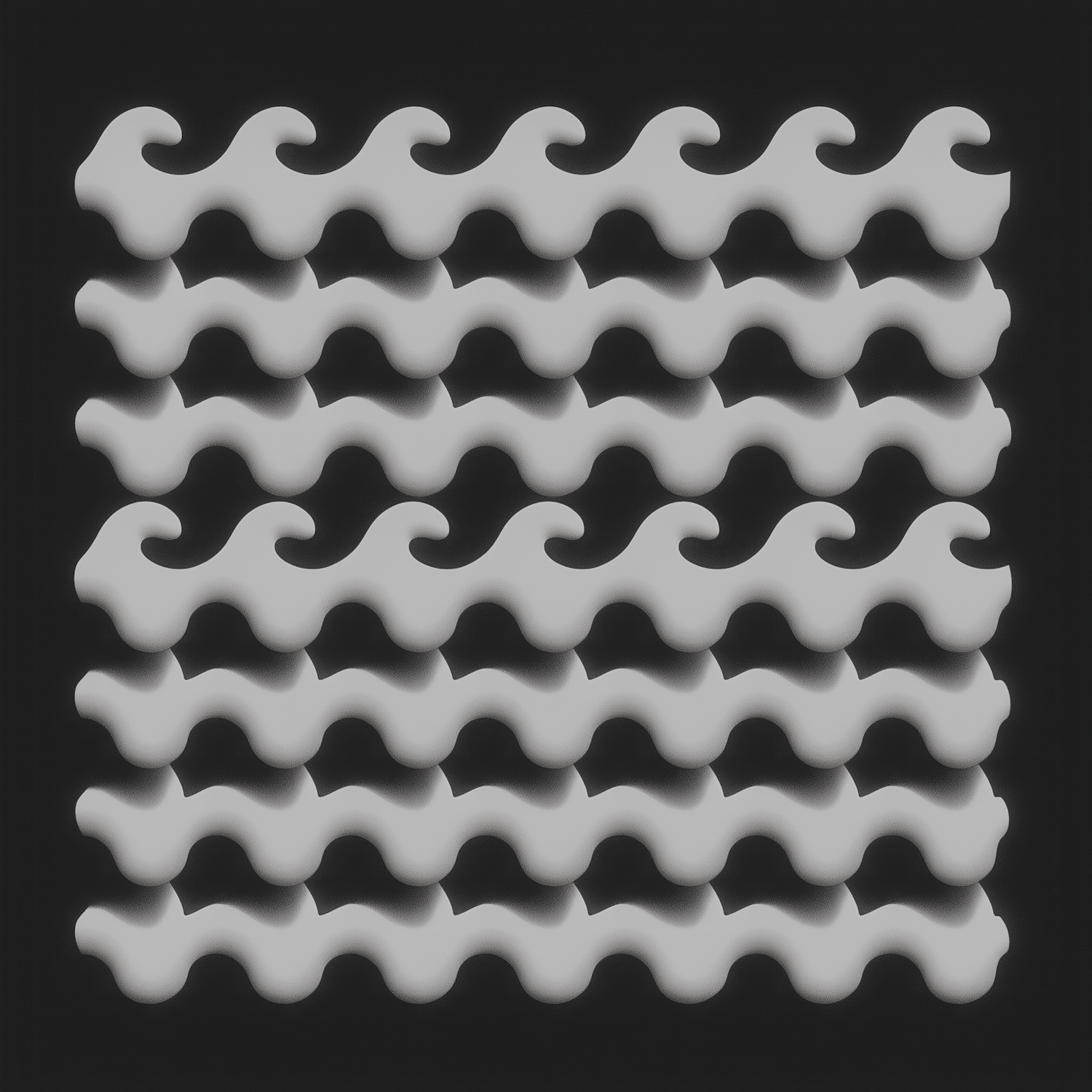 Symmetrical wavy white shapes in rows on a black background, creating a modern, minimalistic geometric pattern.