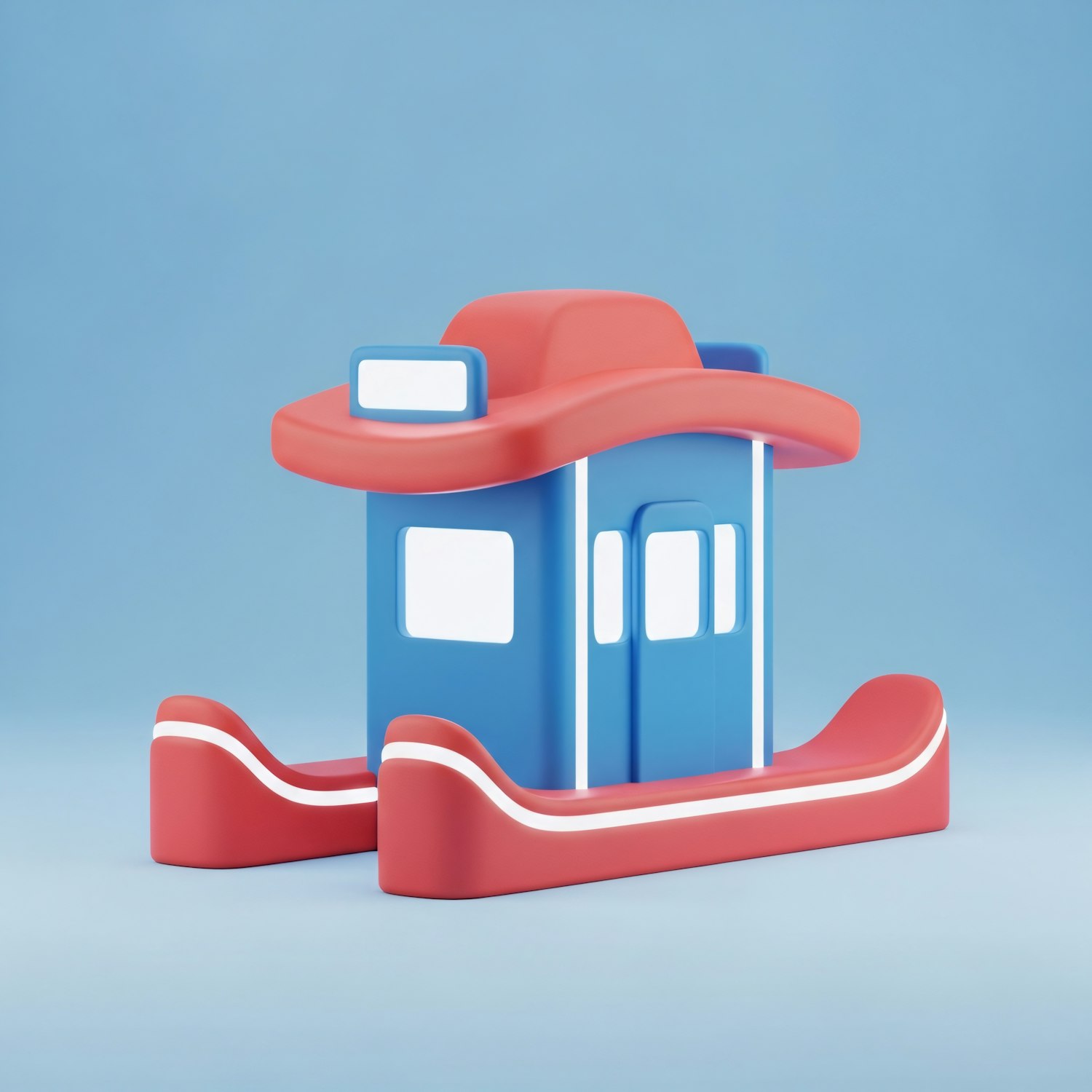 A colorful 3D model of a small building with a blue body, red roof, and white accents, set against a light blue background.