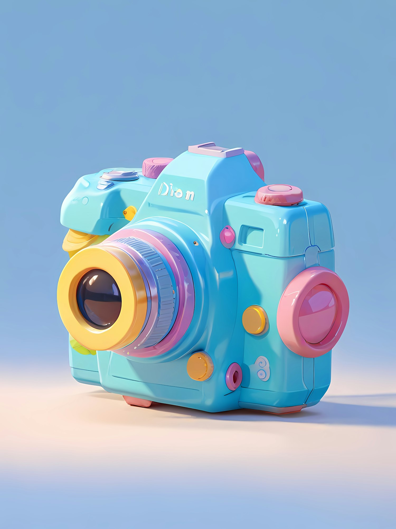 A colorful 3D-rendered toy camera with pastel hues of blue, pink, and yellow, perfect for playful and creative vibes.