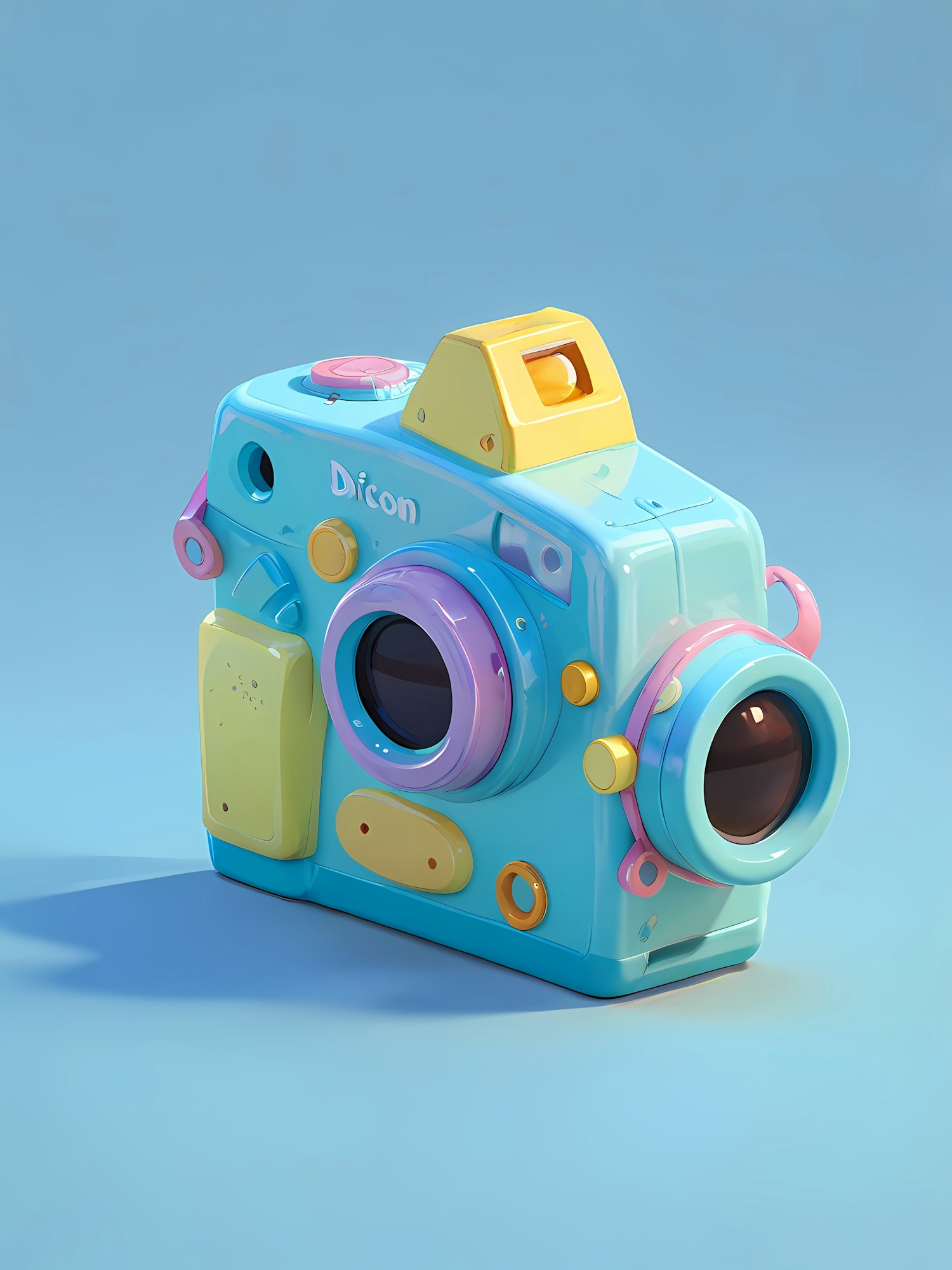 A playful 3D-rendered toy camera in pastel blue, yellow, and pink hues, set against a clean light blue background.