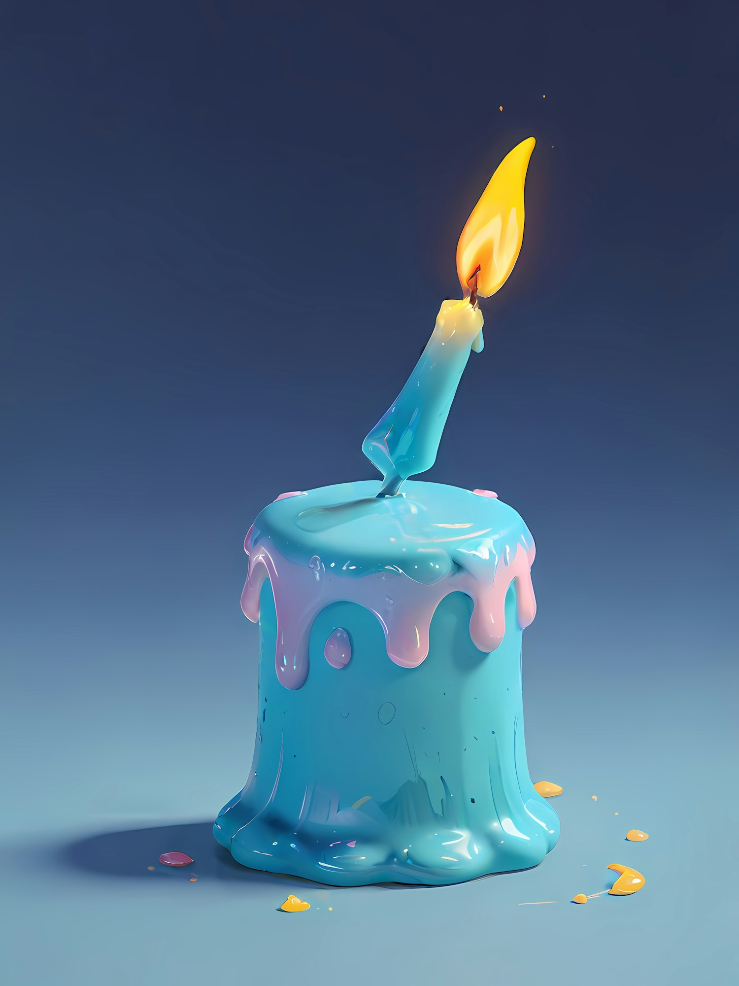 A quirky 3D-rendered blue candle with pink drips and a glowing flame, set against a deep blue gradient background.