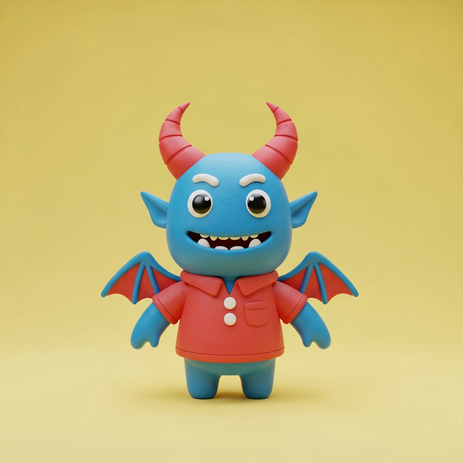 A cute 3D cartoon character with blue skin, red horns, and a red shirt, set against a bright yellow background.
