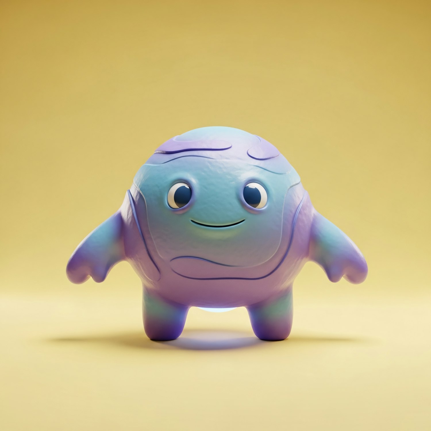 A cute 3D character with a pastel blue and purple gradient body, big eyes, and a friendly smile, set against a warm yellow background.