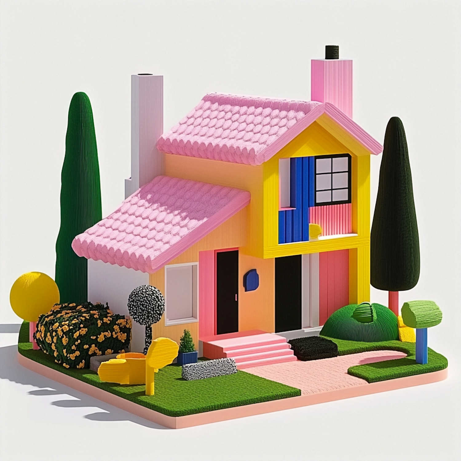 A colorful 3D illustration of a whimsical house with a pink roof, vibrant walls, and playful landscaping in a surreal, artistic style.