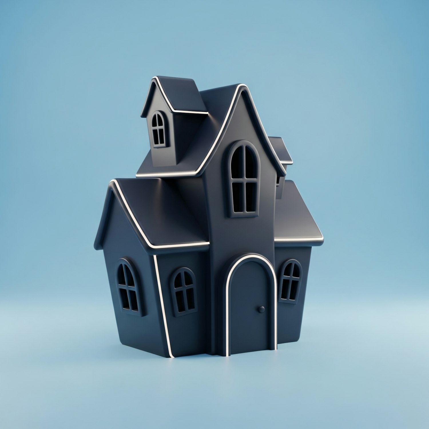 A whimsical 3D model of a dark blue house with white accents, set against a light blue background, showcasing a playful design.