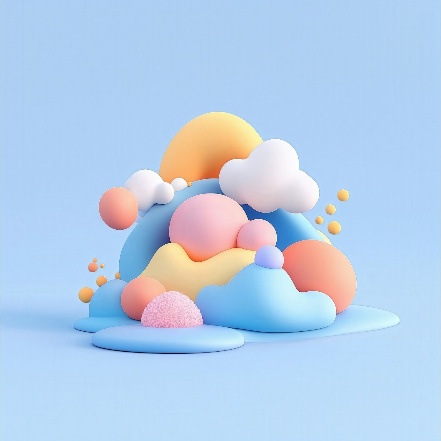 Playful 3D pastel shapes in pink, blue, and yellow form an abstract, cloud-like landscape on a light blue background.