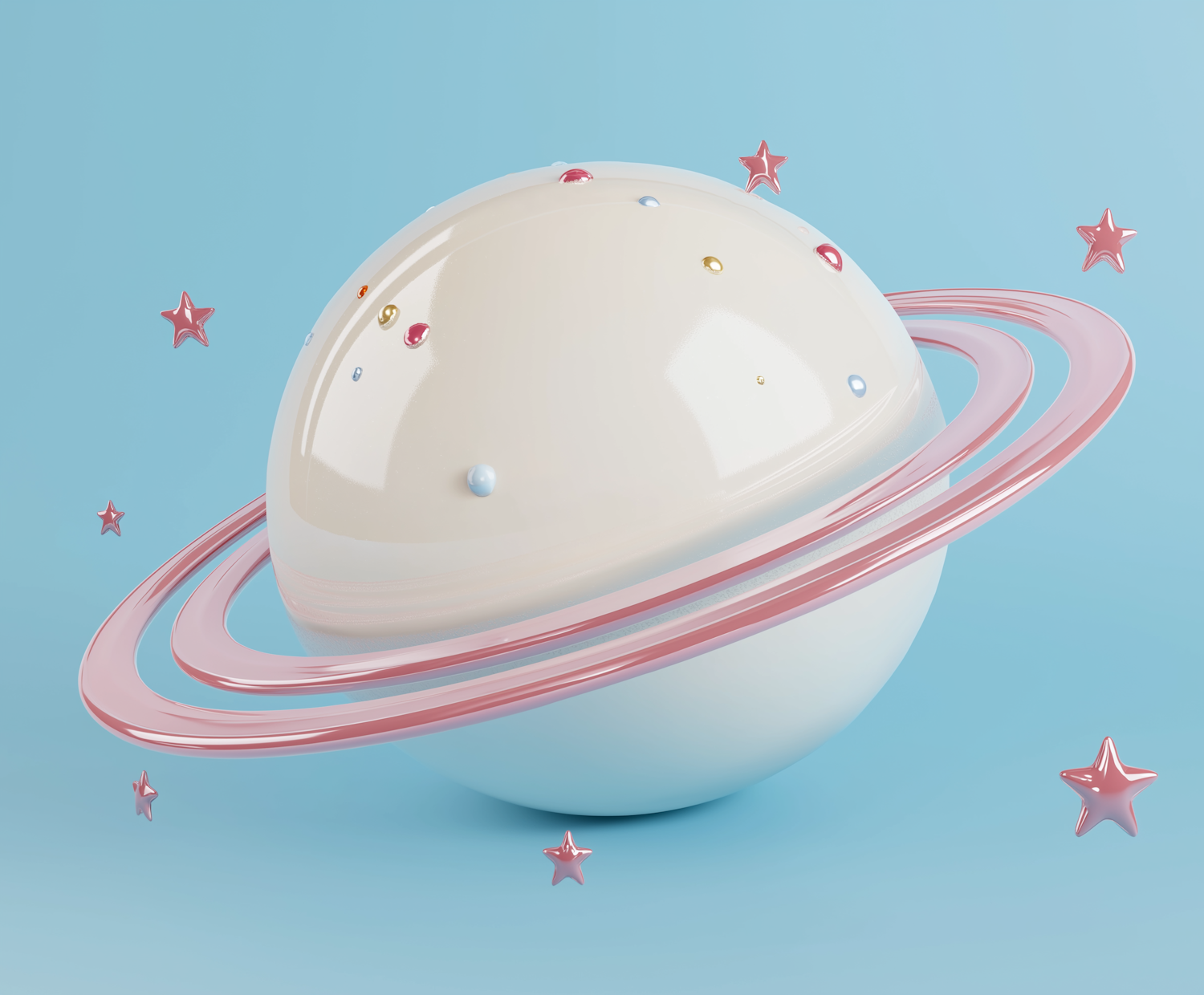 Whimsical 3D planet with a pink ring and colorful spheres, surrounded by floating stars on a pastel blue background.