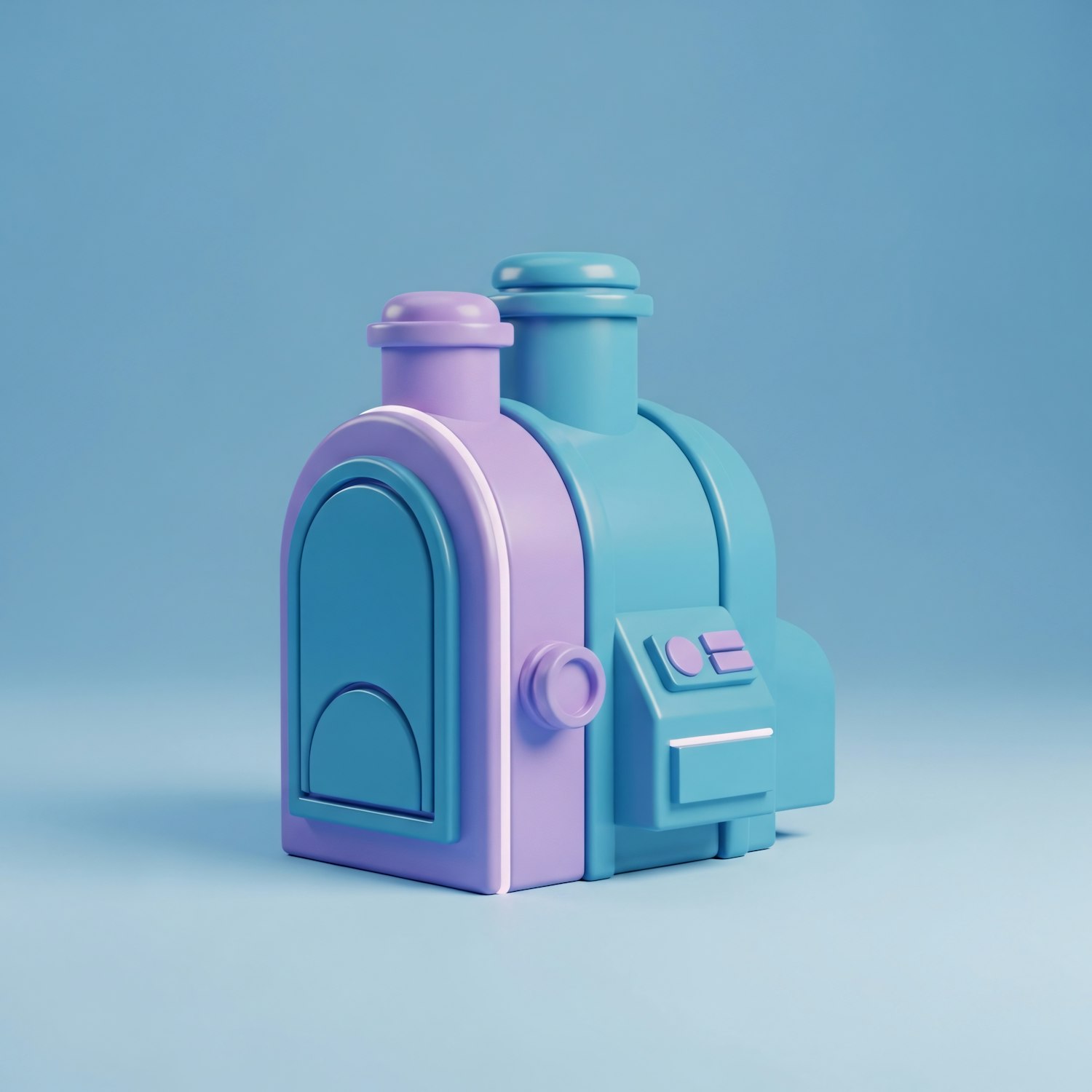 A vibrant 3D model of a whimsical machine in pastel blue and purple tones, set against a solid light blue background.