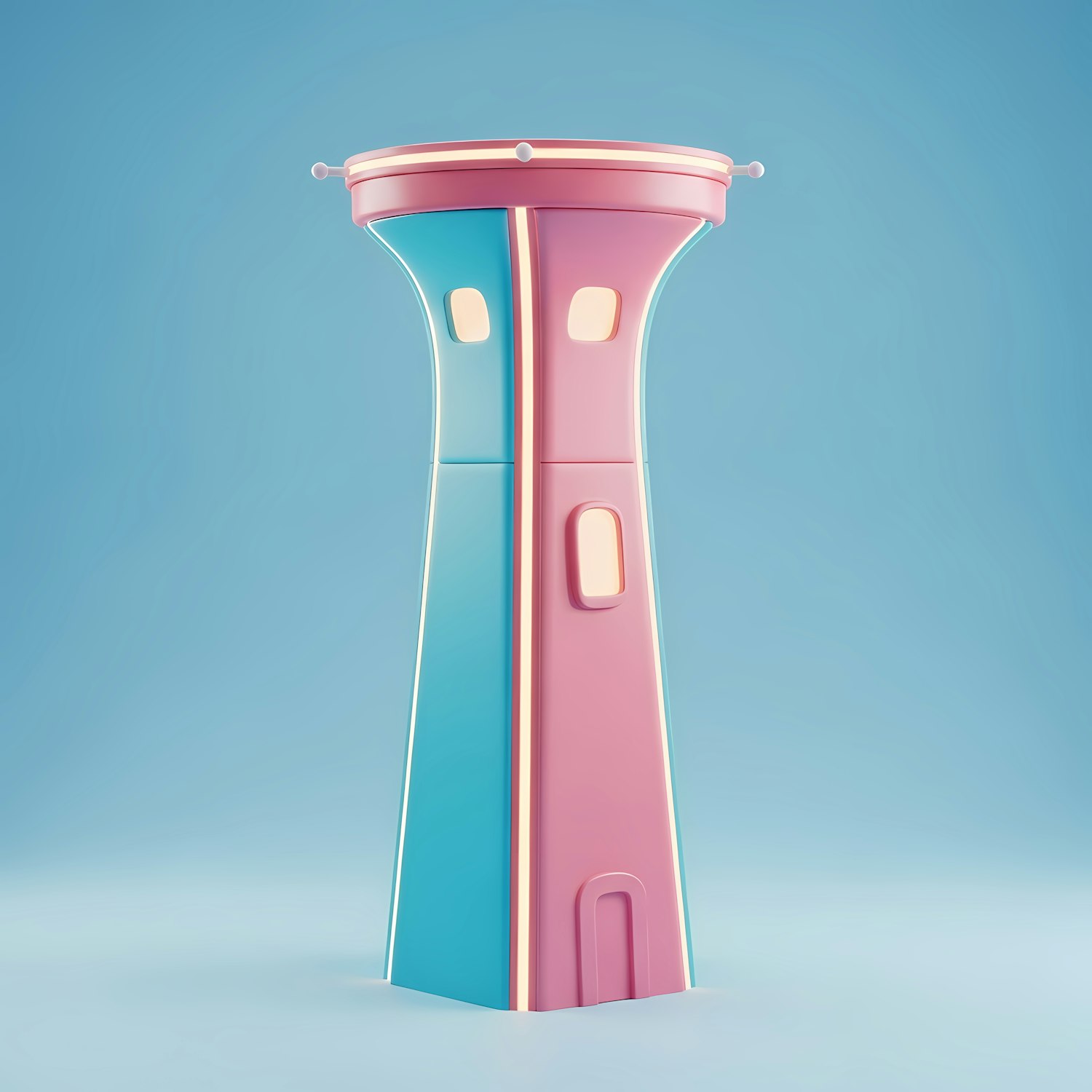A colorful 3D-rendered tower with a playful pastel pink and blue design, set against a light blue background.