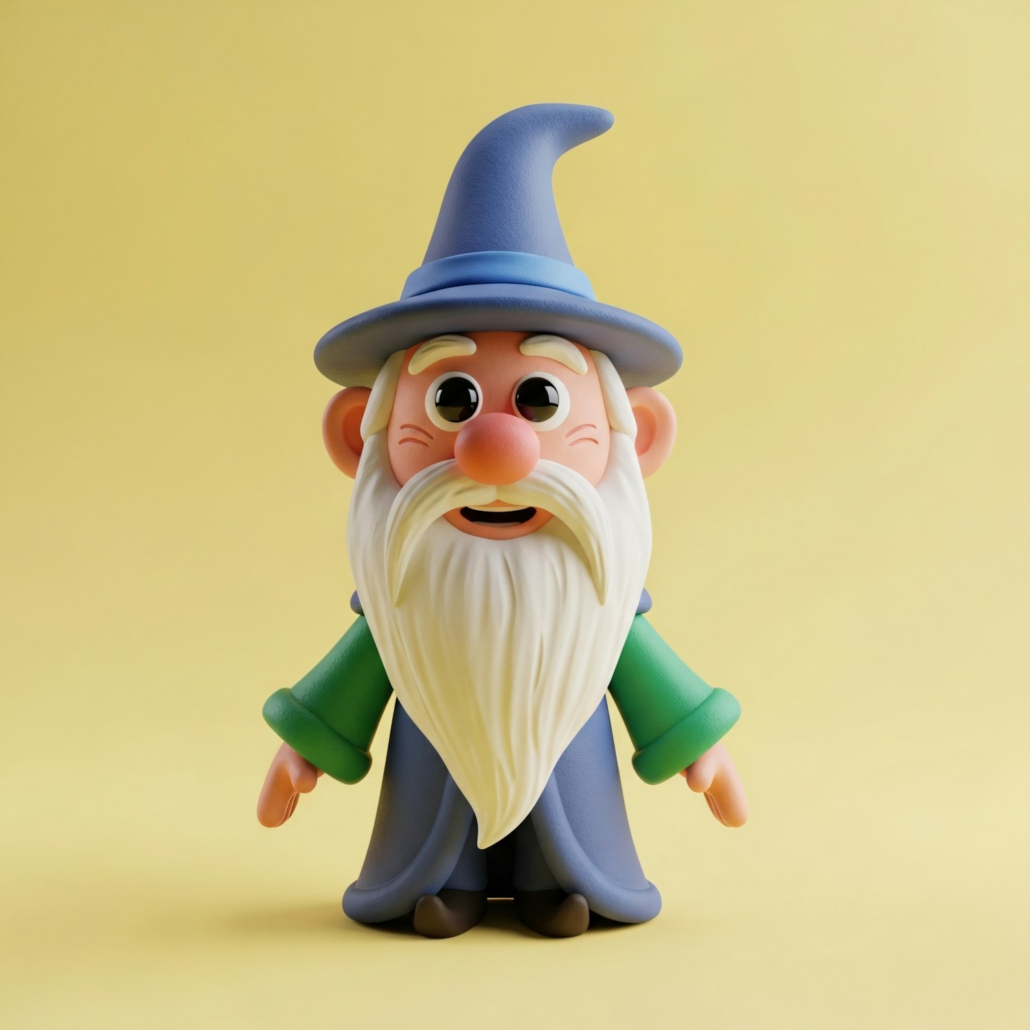 A cheerful 3D cartoon wizard with a blue hat and green robe, set against a yellow background, perfect for whimsical designs.
