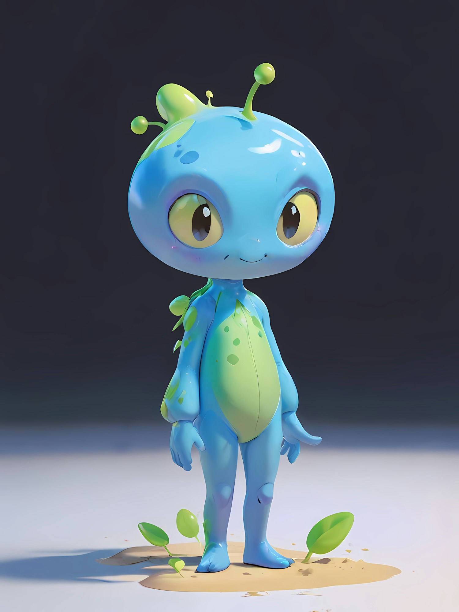Adorable 3D alien with blue skin, green accents, and big yellow eyes, standing on sandy ground with sprouting leaves. Perfectly whimsical!