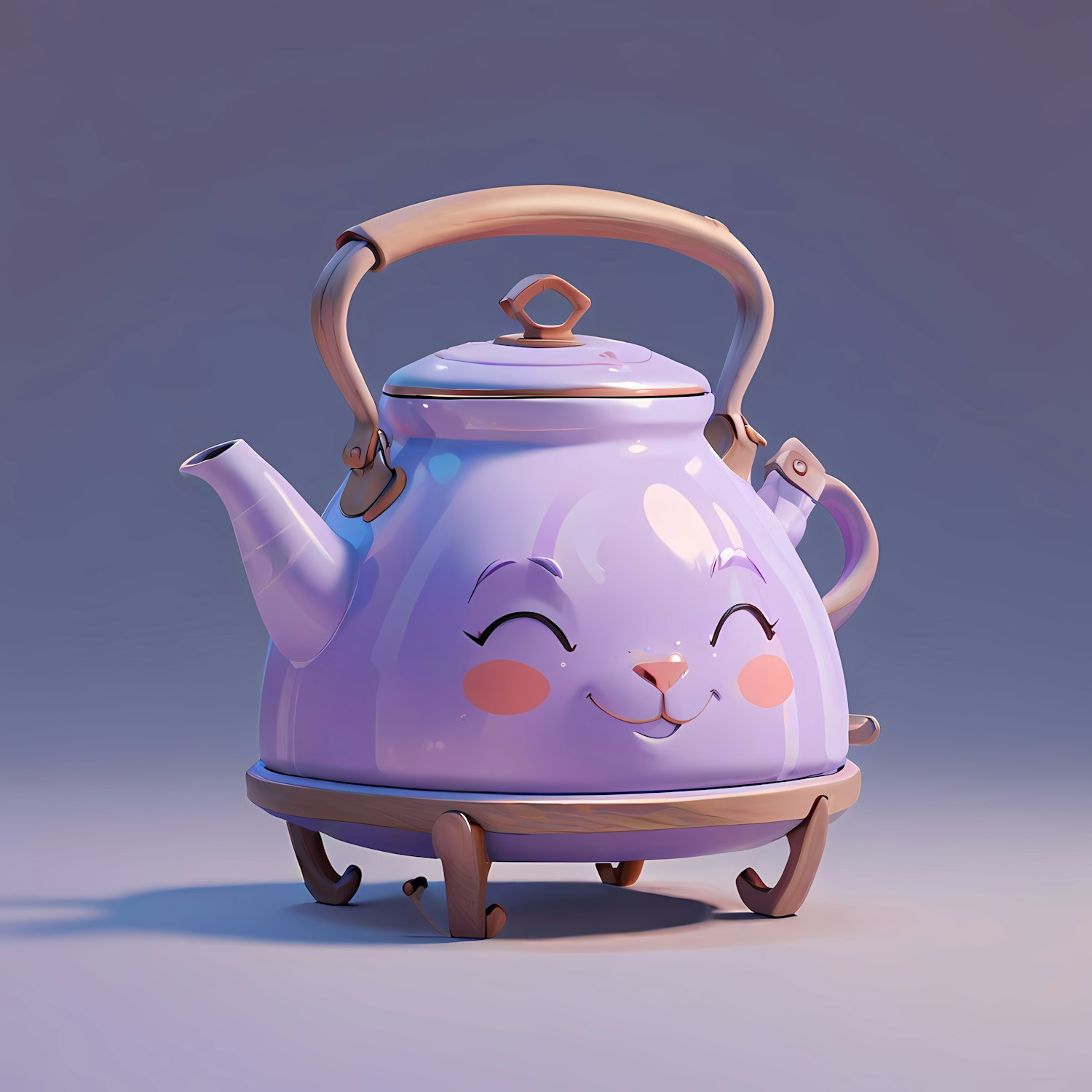 Charming cartoon-style purple teapot with a smiling face, wooden handle, and stand. Perfect for whimsical kitchen decor.