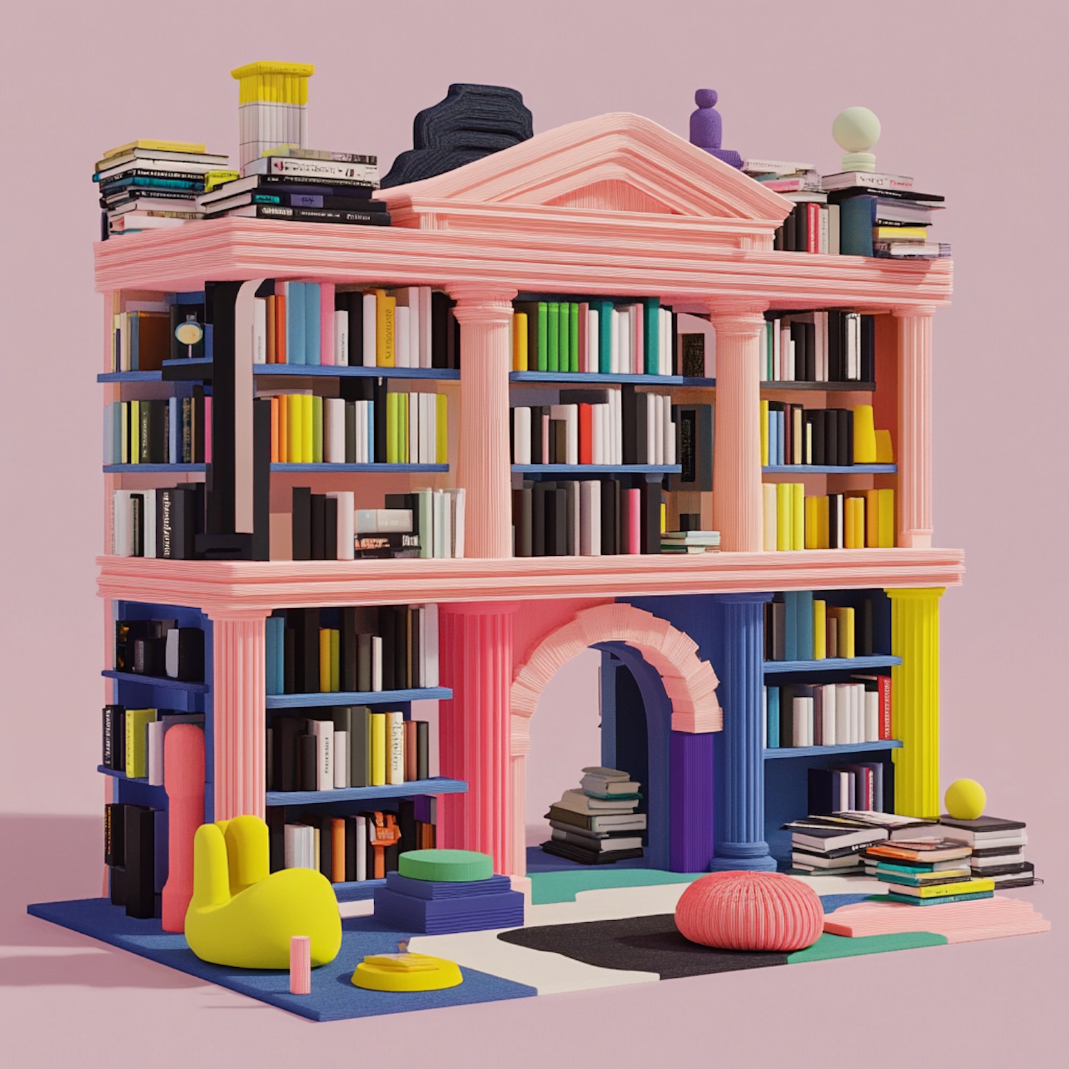 A pastel-colored bookshelf styled like a classical building, filled with books and surrounded by colorful, modern furniture pieces.