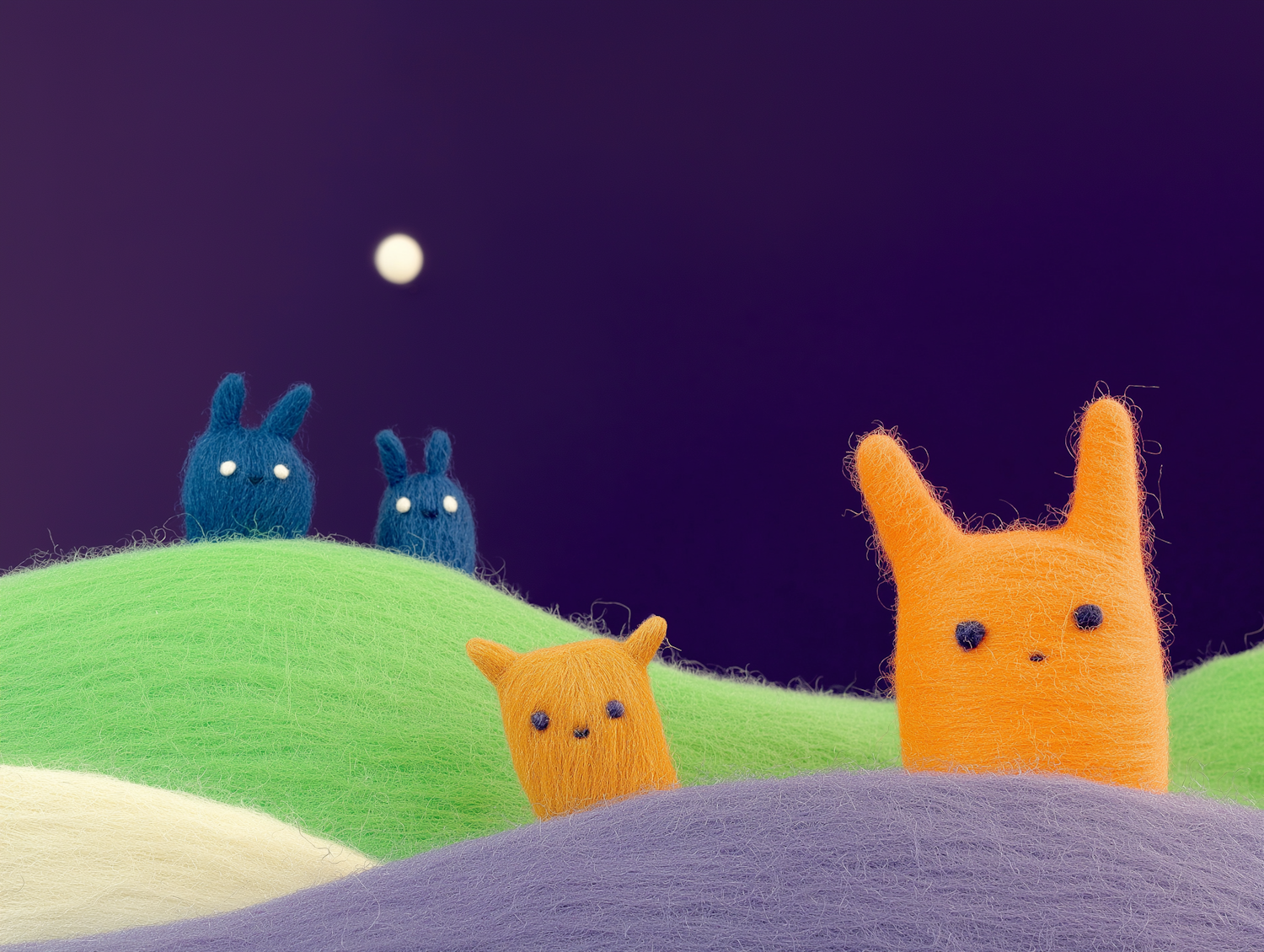 Colorful felt creatures resembling rabbits under a night sky with a full moon, set on vibrant hills of green, lavender, and yellow.